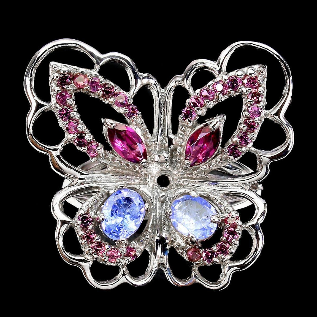 925 STERLING SILVER;PLATE-14K WHITE GOLD;RING SIZE -8(RESIZABLE);MAIN STONE-TANZANITE;OTHER GEMS-RHODOLITE GARNET;TOTAL WEIGHT-5.91 GRAM (TOTAL WEIGHT OF SILVER + STONE);DIMENSION-* STONE 1.0 TO 6.0 X 3.0 MM. * RING SIZE 8.0 * FACE RING 25.0 X 23.0 MM.;MAIN STONE SHAPE-OVAL; MAIN STONE COLOR-BLUE VIOLET;CLARITY/GRADE-IF TO VVS;TREATMENT-UNHEATED;ORIGIN-TANZANIA - AFRICA;HARDNESS-7;