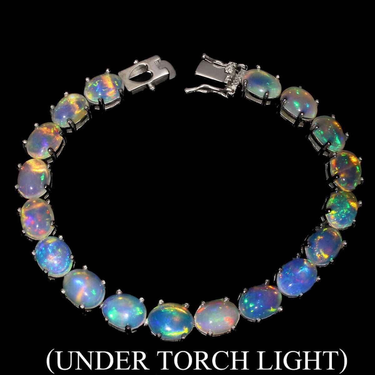 925 STERLING SILVER;PLATE....14K WHITE GOLD;LENGTH (INCHES)8;MAIN STONE-FIRE white OPAL;TOTAL WEIGHT94.36 CT (TOTAL WEIGHT OF SILVER + STONE)DIMENSION* STONE 9.0 X 7.0 MM. * FACE BRACELET 165.0 X 8.0 MM.;MAIN STONE SHAPE-OVAL CABOCHON;MAIN STONE COLOR-RAINBOW FULL FLASH;CLARITY/GRADE-IF;TREATMENT-UNHEATED;ORIGIN-ETHIOPIA;HARDNESS-5.5 - 6.5;