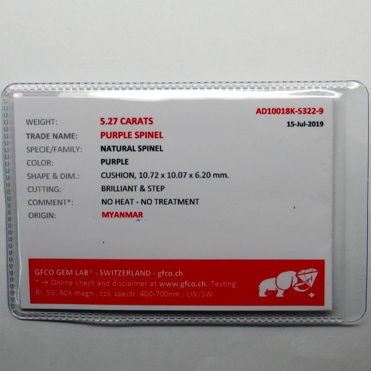 Natural Untreated Burma Purple Spinel - Certified; SHAPE Classic Cushion; WEIGHT 5.27 Ct. SIZE 10.72 X 10.07 X 6.2 mm QUANTITY 1 Piece COLOR Purple Pink CLARITY SI LUSTER Superior ORIGIN Myanmar/Burma; TREATMENT None HARDNESS 8