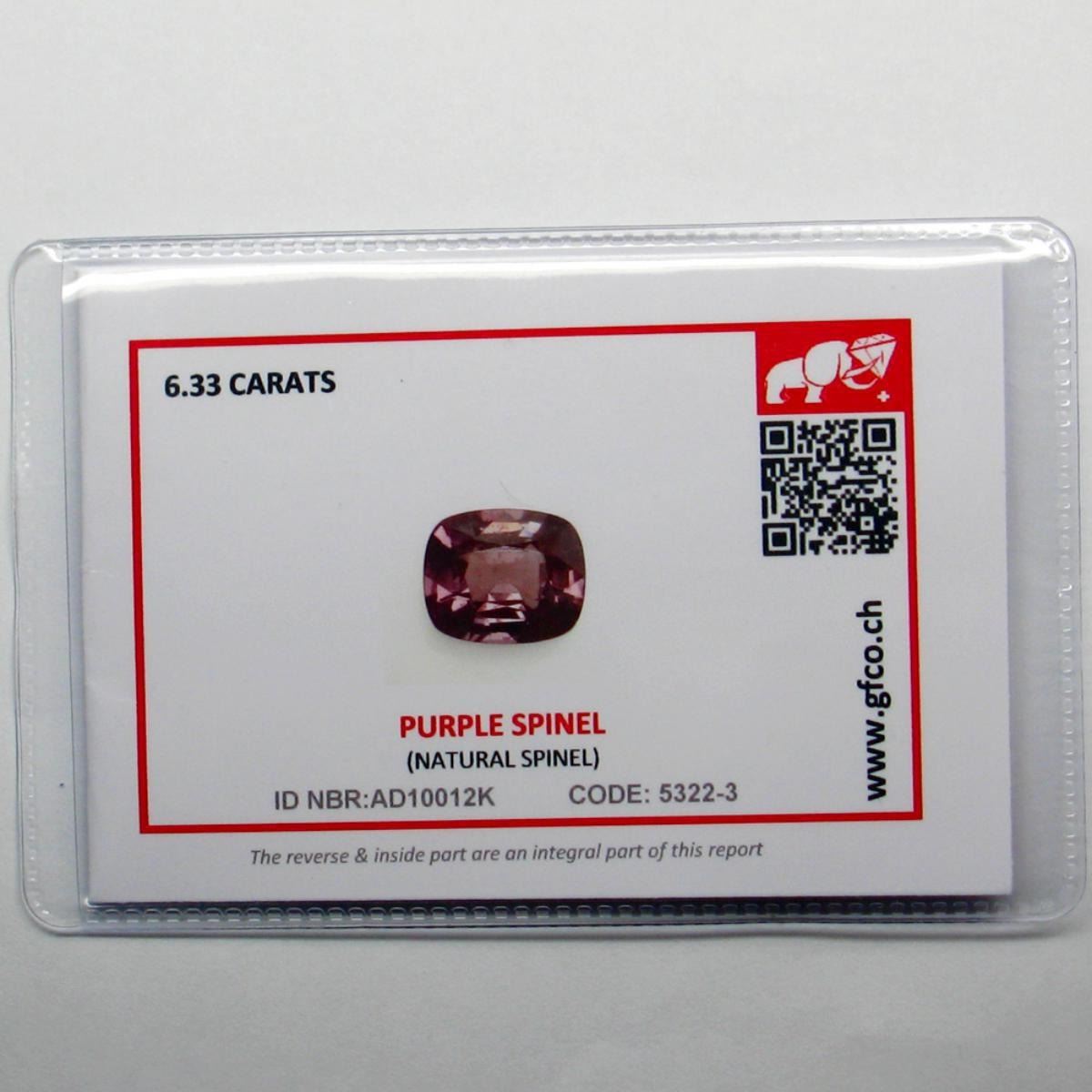 Natural Untreated Burma Purple Spinel - Certified ; SHAPE - Classic Cushion; WEIGHT 6.33 Ct.; SIZE 12.2 X 10.47 X 6.39 mm; QUANTITY 1 Piece; COLOR Purple CLARITY VS; LUSTER Superior ORIGIN Myanmar/Burma; TREATMENT None HARDNESS 8