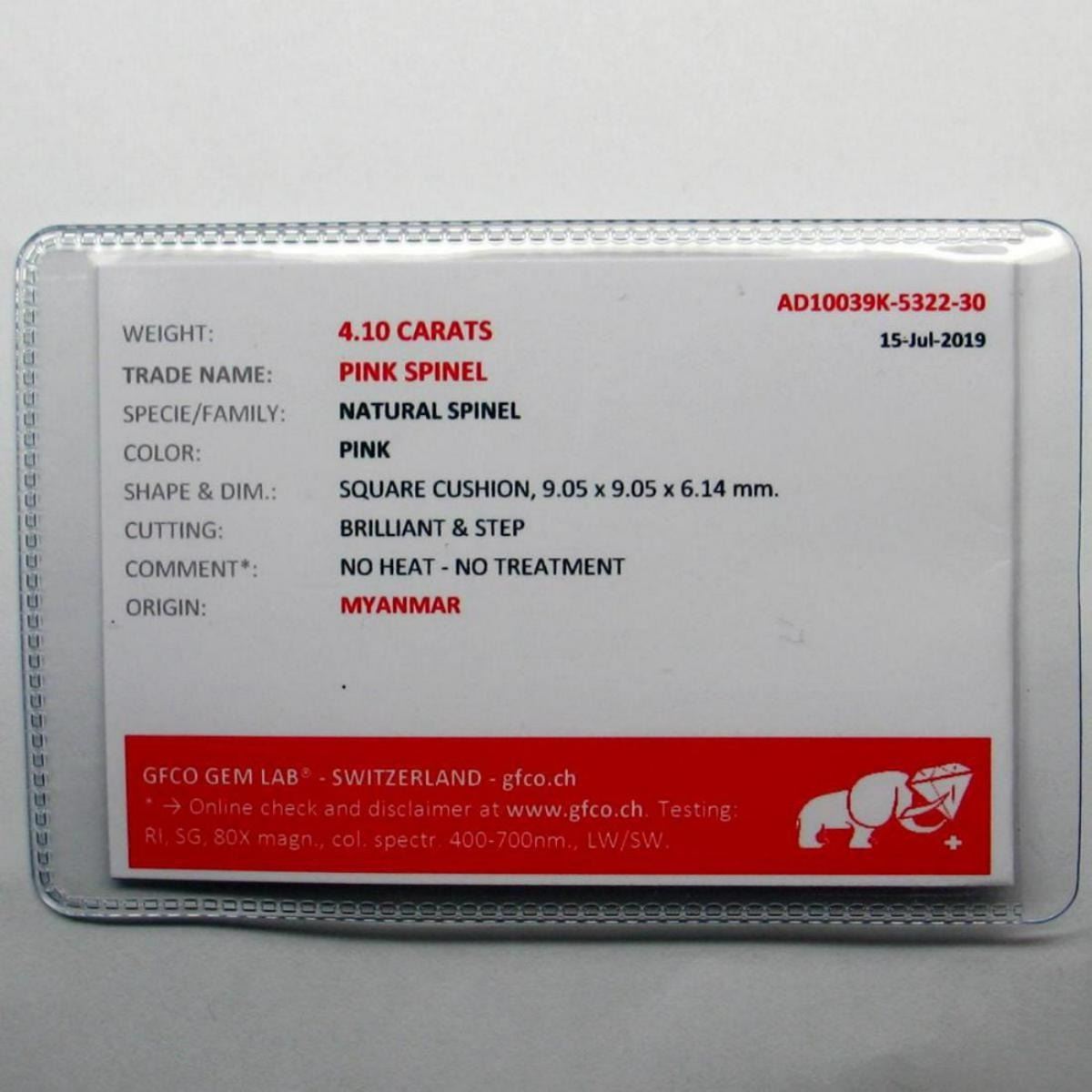 Natural Untreated Burma Purple Spinel - Certified; SHAPE Classic Cushion; WEIGHT 4.10 Ct.; SIZE 9.05 X 9.05 X 6.14 mm; QUANTITY 1 Piece; COLOR Lavender; CLARITY VS; LUSTER Superior ORIGIN Myanmar TREATMENT None HARDNESS 8