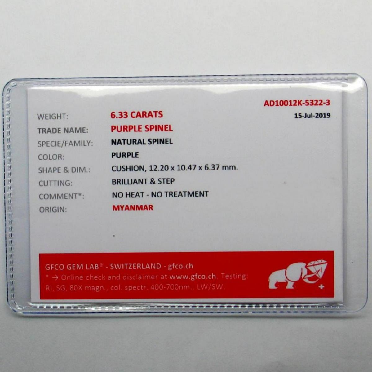 Natural Untreated Burma Purple Spinel - Certified ; SHAPE - Classic Cushion; WEIGHT 6.33 Ct.; SIZE 12.2 X 10.47 X 6.39 mm; QUANTITY 1 Piece; COLOR Purple CLARITY VS; LUSTER Superior ORIGIN Myanmar/Burma; TREATMENT None HARDNESS 8