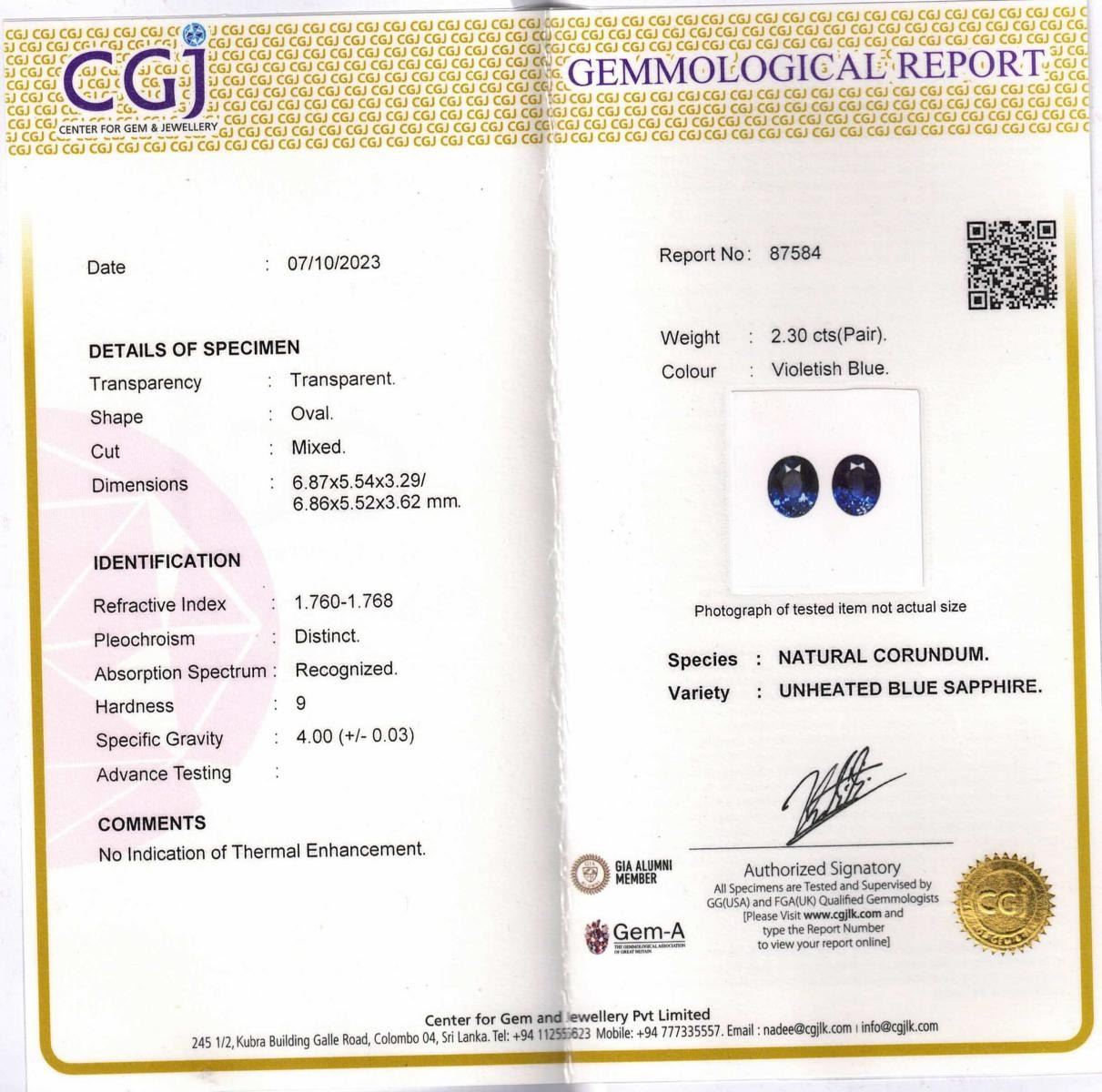 Natural Untreated Ceylon Blue Sapphire Pair 2.30 Cts; Shape - Oval; Size 6.87 x 5.54 x 3.29 / 6.86 x 5.52 x 3.62 MM; Clarity - VS; Color Blue ; No treatment in any way; Certified