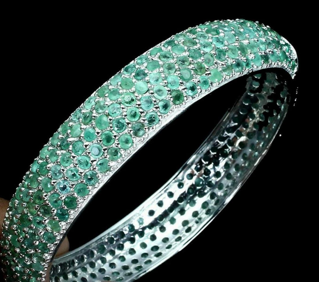 925 STERLING SILVER;PLATE-14K WHITE GOLD;LENGTH- 2.1(INCHES);MAIN STONE-EMERALD;TOTAL WEIGHT-28.57 GRAM (TOTAL WEIGHT OF SILVER + STONE)DIMENSION* STONE 2.0 MM. * DIAMETER 2.1 X 2.0 INCHES. * FACE BANGLE 63.0 X 12.0 MM.;MAIN STONE SHAPE-ROUND CUT;MAIN STONE COLOR- GREEN;TREATMENT-UNHEATED;ORIGIN-Colombia;HARDNESS-7.5 - 8.0