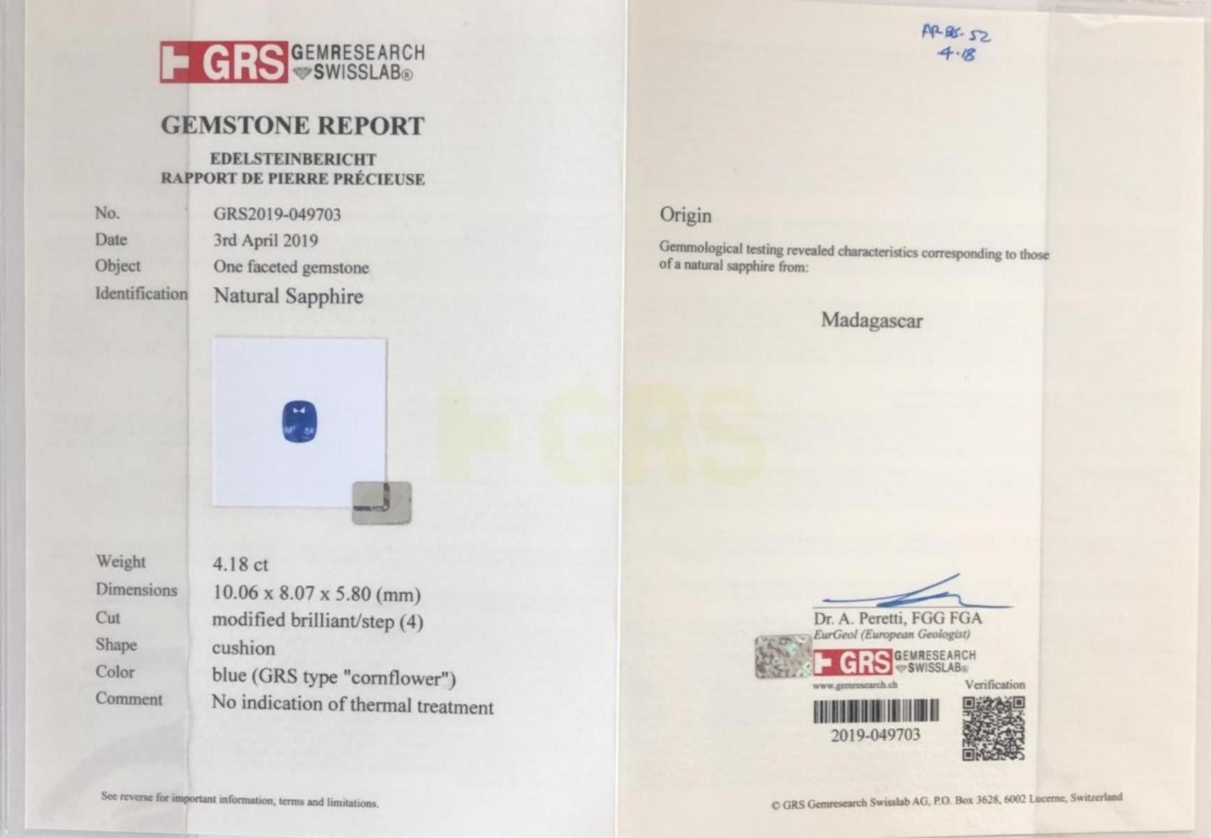 Natural Cornflower Blue Sapphire 4.18 Ct ...cushion cut.....VVS Clarity, Top Luster Fire; completely untreated.....not heated or not treatedin any way....... Origin - Madagascar....Certified by GRS Swiss lab. (Stock Ref- 7k)