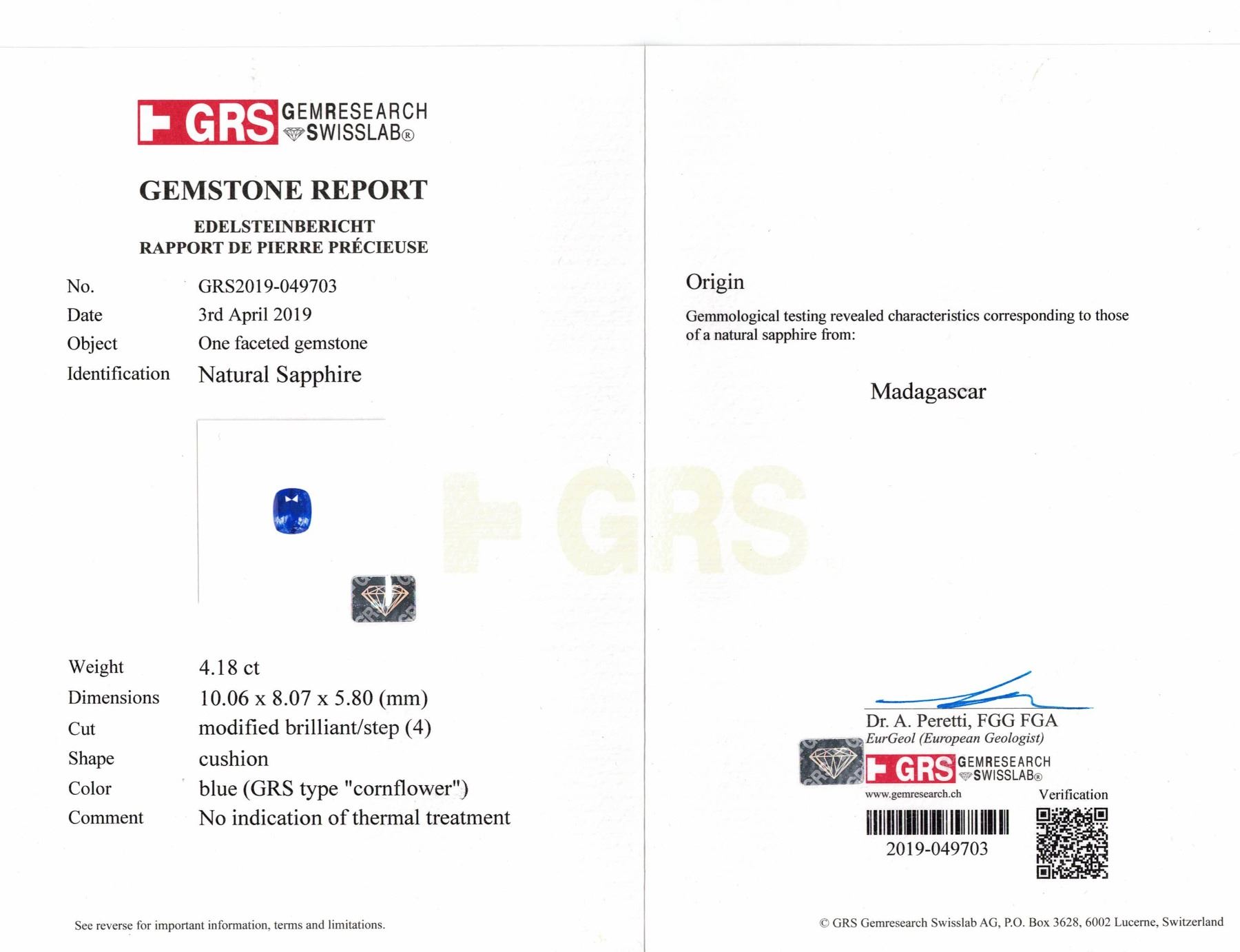 Natural Cornflower Blue Sapphire 4.18 Ct ...cushion cut.....VVS Clarity, Top Luster Fire; completely untreated.....not heated or not treatedin any way....... Origin - Madagascar....Certified by GRS Swiss lab. (Stock Ref- 7k) video available upon request