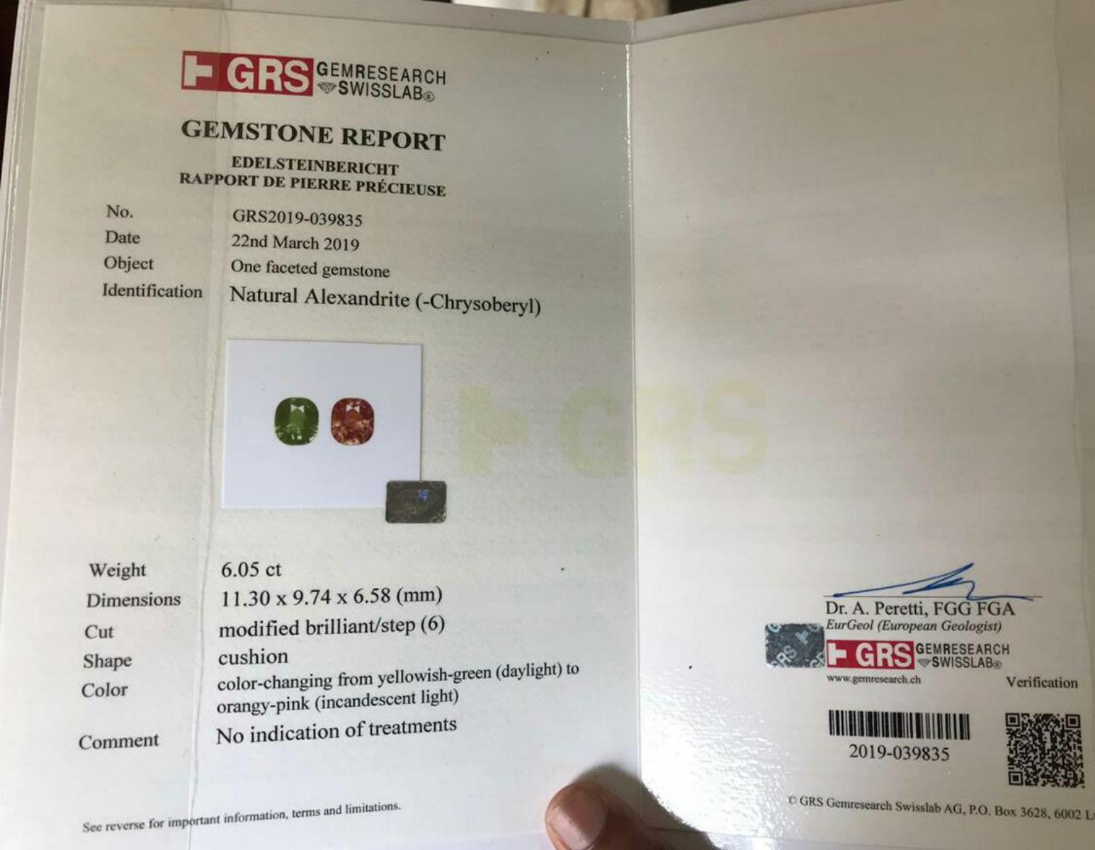 Natural Cushion Alexandrite 6.05 Ct.....classic cushion cut, VS clarity, Origin - Ceylon; Color change from green to Orangy-pink as stated by GRS lab in the certificate.