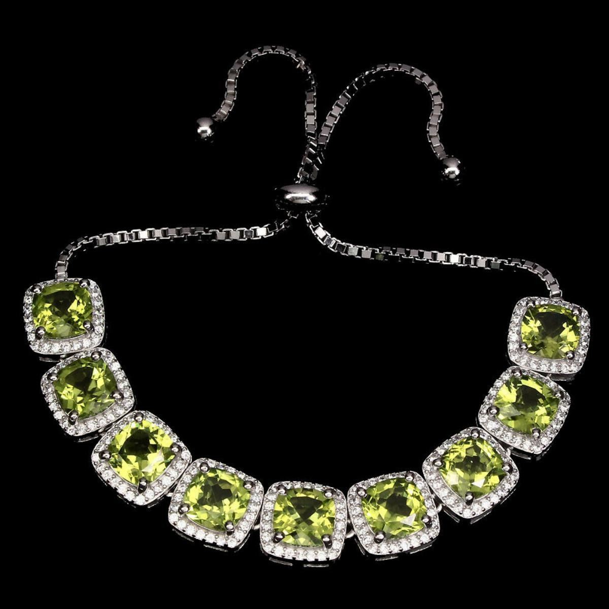 925 STERLING SILVER;PLATE-14K WHITE GOLD;LENGTH (INCHES)-10;MAIN STONE-PERIDOT;OTHER GEMS-CUBIC ZIRCONIA;TOTAL WEIGHT-68.39 CT (TOTAL WEIGHT OF SILVER + STONE)DIMENSION* STONE 7.0 MM. * CZ 1.0 MM. * FACE BRACELET 95.0 X 10.0 MM.;MAIN STONE SHAPE-CUSHION CUT;MAIN STONE COLOR-TOP RICH GREEN;CLARITY/GRADE-IF TO VVS;LUSTER-PRECIOUS;TREATMENT-UNHEATED;ORIGIN-PAKISTAN;HARDNESS-6.5 - 7.0;