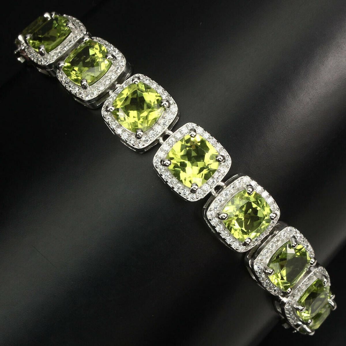 925 STERLING SILVER;PLATE-14K WHITE GOLD;LENGTH (INCHES)-10;MAIN STONE-PERIDOT;OTHER GEMS-CUBIC ZIRCONIA;TOTAL WEIGHT-68.39 CT (TOTAL WEIGHT OF SILVER + STONE)DIMENSION* STONE 7.0 MM. * CZ 1.0 MM. * FACE BRACELET 95.0 X 10.0 MM.;MAIN STONE SHAPE-CUSHION CUT;MAIN STONE COLOR-TOP RICH GREEN;CLARITY/GRADE-IF TO VVS;LUSTER-PRECIOUS;TREATMENT-UNHEATED;ORIGIN-PAKISTAN;HARDNESS-6.5 - 7.0;