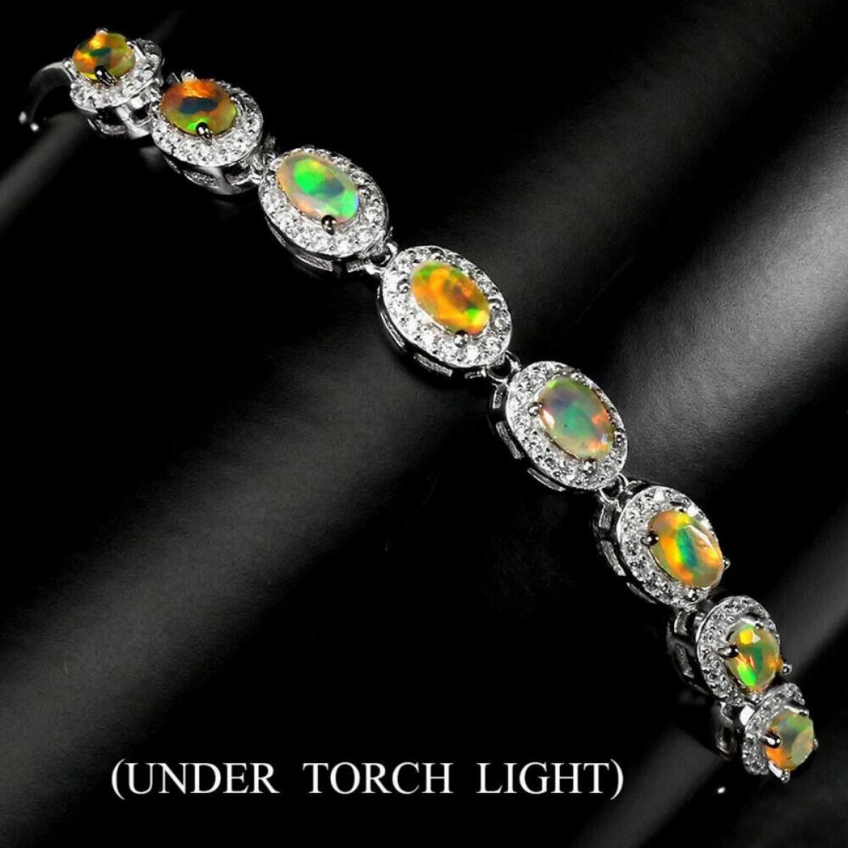 925 STERLING SILVER;PLATE-14K WHITE GOLDLENGTH (INCHES)7;MAIN STONE-FIRE OPAL;TOTAL WEIGHT-6.32 GRAM (TOTAL WEIGHT OF SILVER + STONE)DIMENSION-* STONE 5.0 X 3.0 MM. * CZ 1.0 MM. * FACE BRACELET 70.0 X 6.0 MM.;MAIN STONE SHAPE-OVAL CUT;MAIN STONE COLOR-HOT RAINBOW LUSTER;CLARITY/GRADE-IF TO VVS;TREATMENT-UNHEATED;ORIGIN-ETHIOPIA;HARDNESS-5.5 - 6.5;