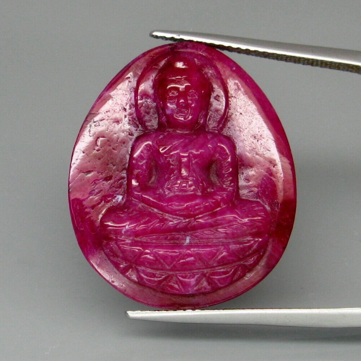 Natural Ruby Unheated ;SHAPE Buddha Statue Carving; WEIGHT 32.74 Ct. SIZE 25.4 X 21.5 X 7 mm QUANTITY 1 Piece; COLOR Hot Red PinkCLARITYTRANSLUCENTLUSTERAttractiveORIGINWinza, Tanzania; TREATMENT UnHeated HARDNESS 9