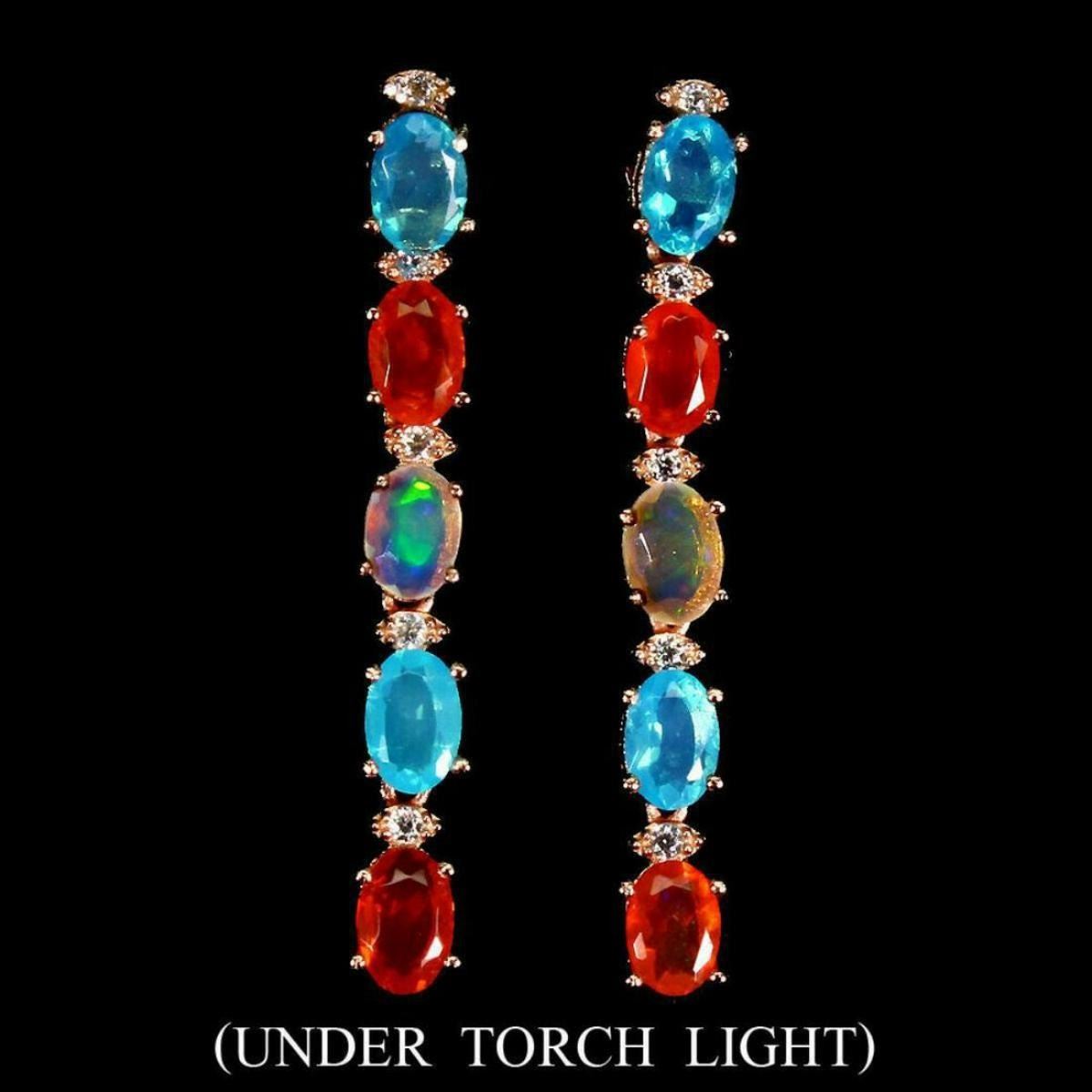 925 STERLING SILVER;;PLATE-14K ROSE GOLDMAIN STONE-FIRE OPAL;OTHER GEMS--BLUE FIRE OPAL, CUBIC ZIRCONIA, ORANGE FIRE OPAL;TOTAL WEIGHT-4.51 GRAM (TOTAL WEIGHT OF SILVER + STONE)DIMENSION* STONE 6.0 X 4.0 MM. * CZ 1.5 TO 2.0 MM. * FACE EARRINGS -39.0 X 5.0 MM.;MAIN STONE SHAPE-OVAL CUT;MAIN STONE COLOR-MULTI-COLOR;CLARITY/GRADE-IF TO VVS;TREATMENT-UNHEATED;ORIGIN-ETHIOPIA;HARDNESS-5;
