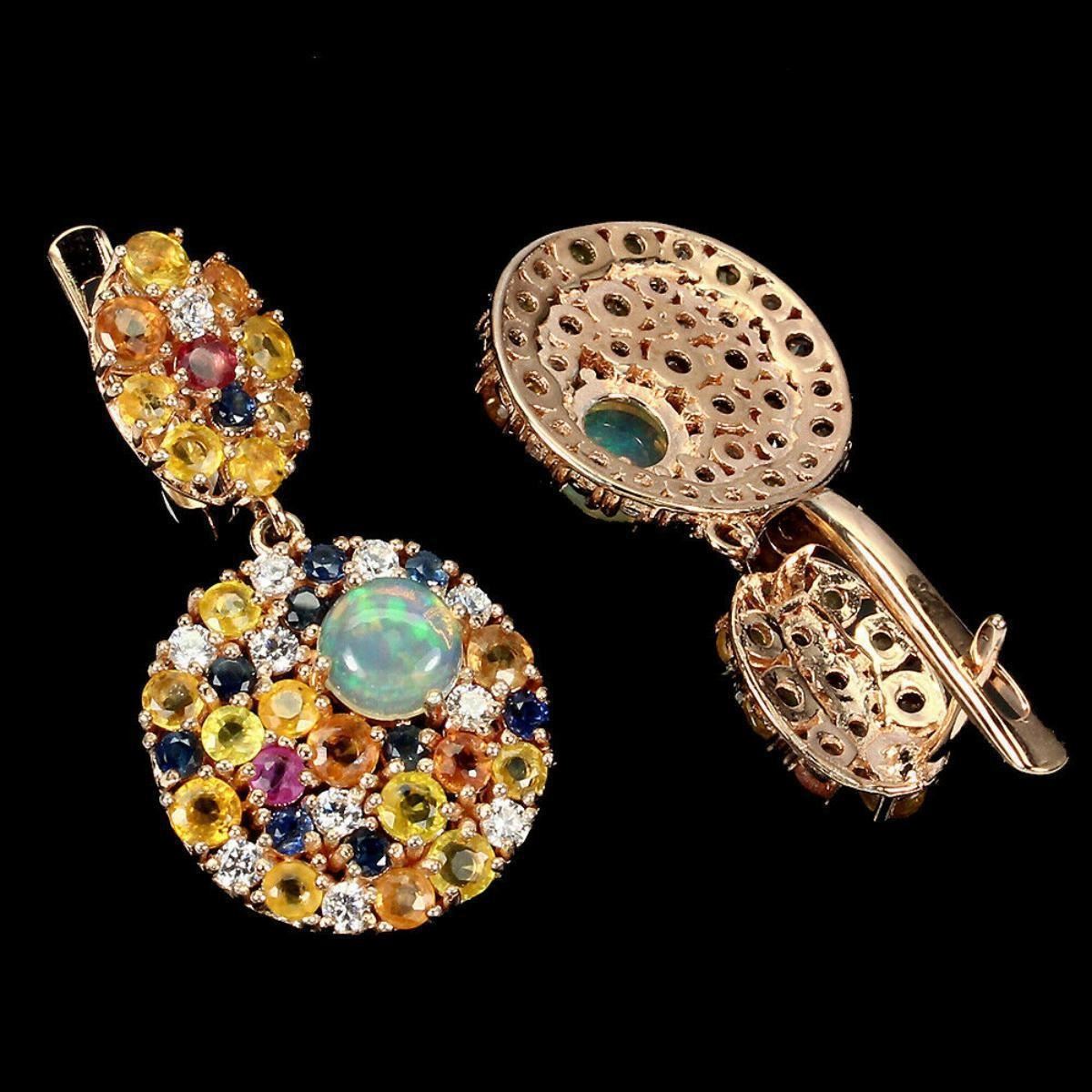 925 STERLING SILVER;;PLATE-14K ROSE GOLD;MAIN STONE-FIRE OPAL;OTHER GEMS-CUBIC ZIRCONIA, SAPPHIRE;TOTAL WEIGHT-7.69 GRAM (TOTAL WEIGHT OF SILVER + STONE)DIMENSION* STONE 2.0 TO 6.0 MM. * CZ 2.0 MM. * FACE EARRINGS 32.0 X 17.0 MM.;MAIN STONE SHAPE-ROUND CABOCHON;MAIN STONE COLOR-MULTI-COLOR;CLARITY/GRADE-TRANSPARENT;LUSTER-PRECIOUS;TREATMENT-UNHEATED;ORIGIN-ETHIOPIA;HARDNESS-5.5 - 9.0;