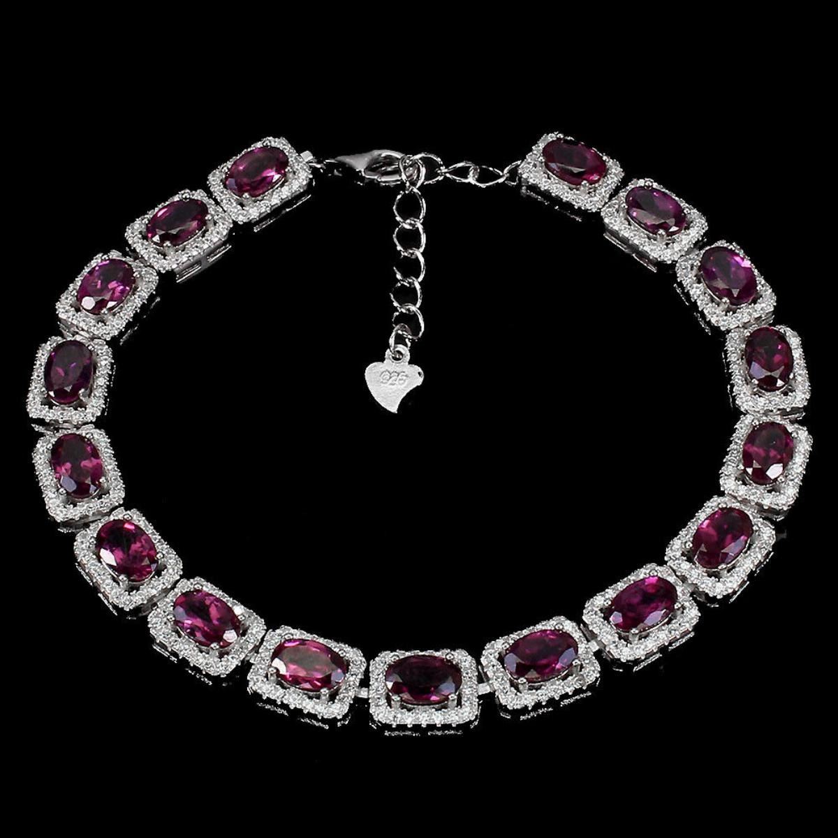 925 STERLING SILVER; PLATE- 14K WHITE GOLD; LENGTH (INCHES) 7; MAIN STONE -RHODOLITE GARNET; TOTAL WEIGHT- 10.78 GRAM (TOTAL WEIGHT OF SILVER + STONE) DIMENSION * STONE 6.0 X 4.0 MM. * CZ 1.0 MM. * TOTAL ;LENGTH- 7.0 INCHES. * FACE BRACELET- 165.0 X 7.0 MM.; MAIN STONE SHAPE- OVAL CUT; MAIN STONE COLOR- TOP RICH PINK RASPBERRY; CLARITY/GRADE- IF TO VVS; TREATMENT UNHEATED; ORIGIN AFRICA; HARDNESS 7.0 - 7.5;
