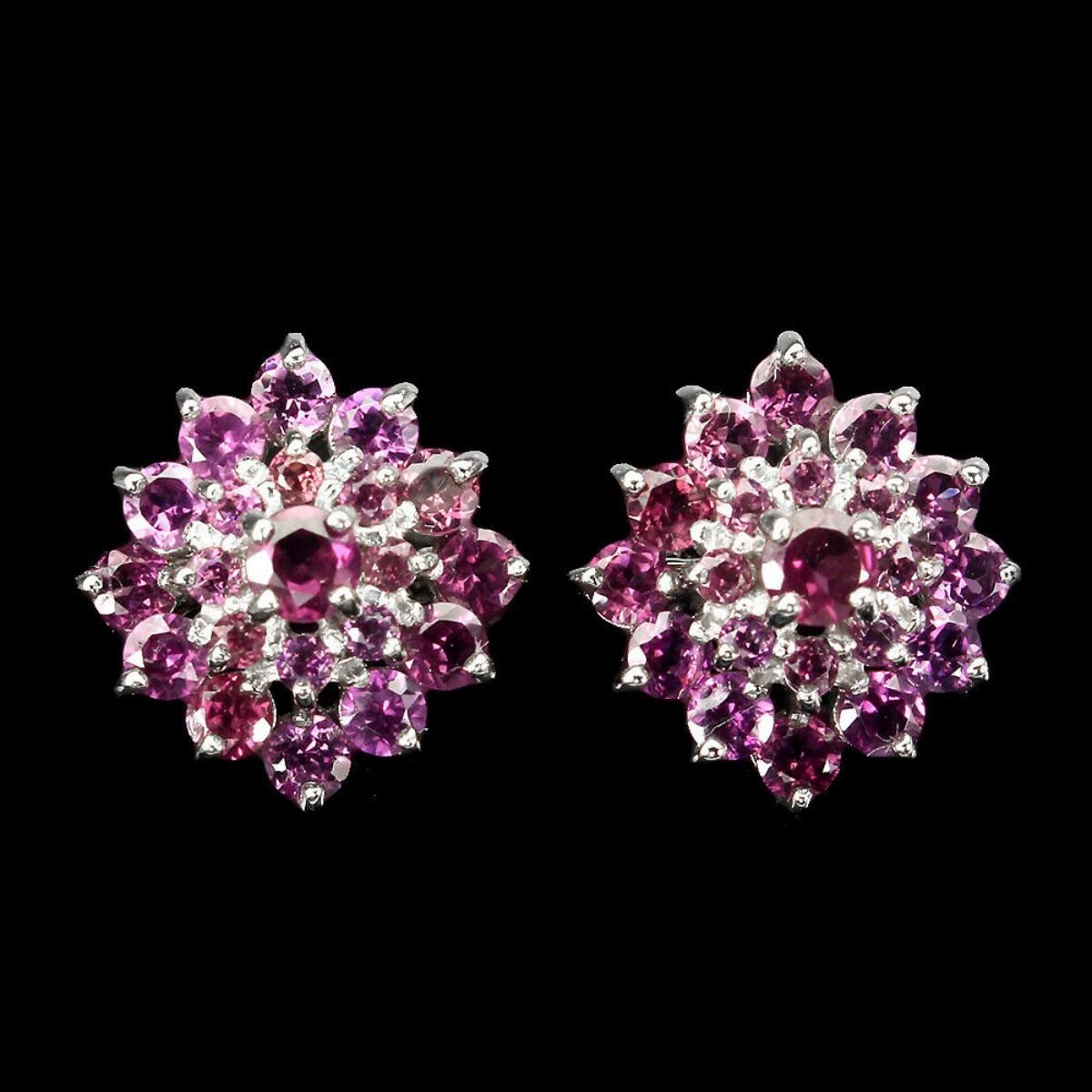 925 STERLING SILVER;PLATE-14K WHITE GOLD;MAIN STONE-RHODOLITE GARNETTOTAL WEIGHT-4.43 GRAM (TOTAL WEIGHT OF SILVER + STONE)DIMENSION-* STONE 1.5 TO 3.5 MM. * FACE EARRINGS 15.0 X 14.0 MM.;MAIN STONE SHAPE-ROUND CUT;MAIN STONE COLOR-TOP RICH PINK RASPBERRY;CLARITY/GRADE-IF TO VVS;TREATMENT-UNHEATED;ORIGIN-AFRICA;HARDNESS-7