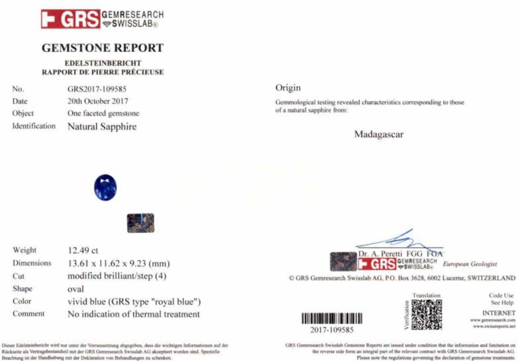Natural Royal Blue Sapphire 12.49 Cts - Completely Untreated....size - 13.61 x 11.56 x 9.21 mm; VVS Clarity; Origin - Madgascar; Certified By GRS Swiss Lab ; GIA USA Lab