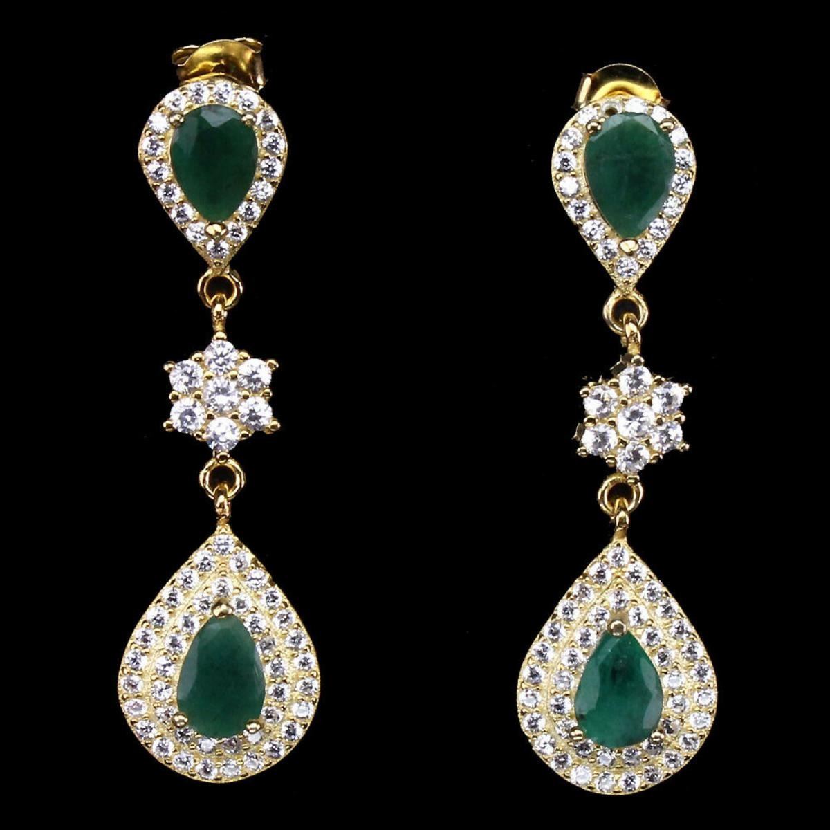 925 STERLING SILVER;PLATE-14K YELLOW GOLD;MAIN STONE-EMERALD;OTHER GEMS-CUBIC ZIRCONIA;TOTAL WEIGHT-28.62 CT (TOTAL WEIGHT OF SILVER + STONE)DIMENSION* STONE 7.0 X 5.0 MM. * CZ 1.5 TO 2.0 MM. * FACE EARRINGS 40.0 X 12.0 MM.;MAIN STONE SHAPE-PEAR CUT;MAIN STONE COLOR-TOP RICH GREEN;TREATMENT-UNHEATED;ORIGIN-BRAZIL;HARDNESS-7.5 - 8.0;