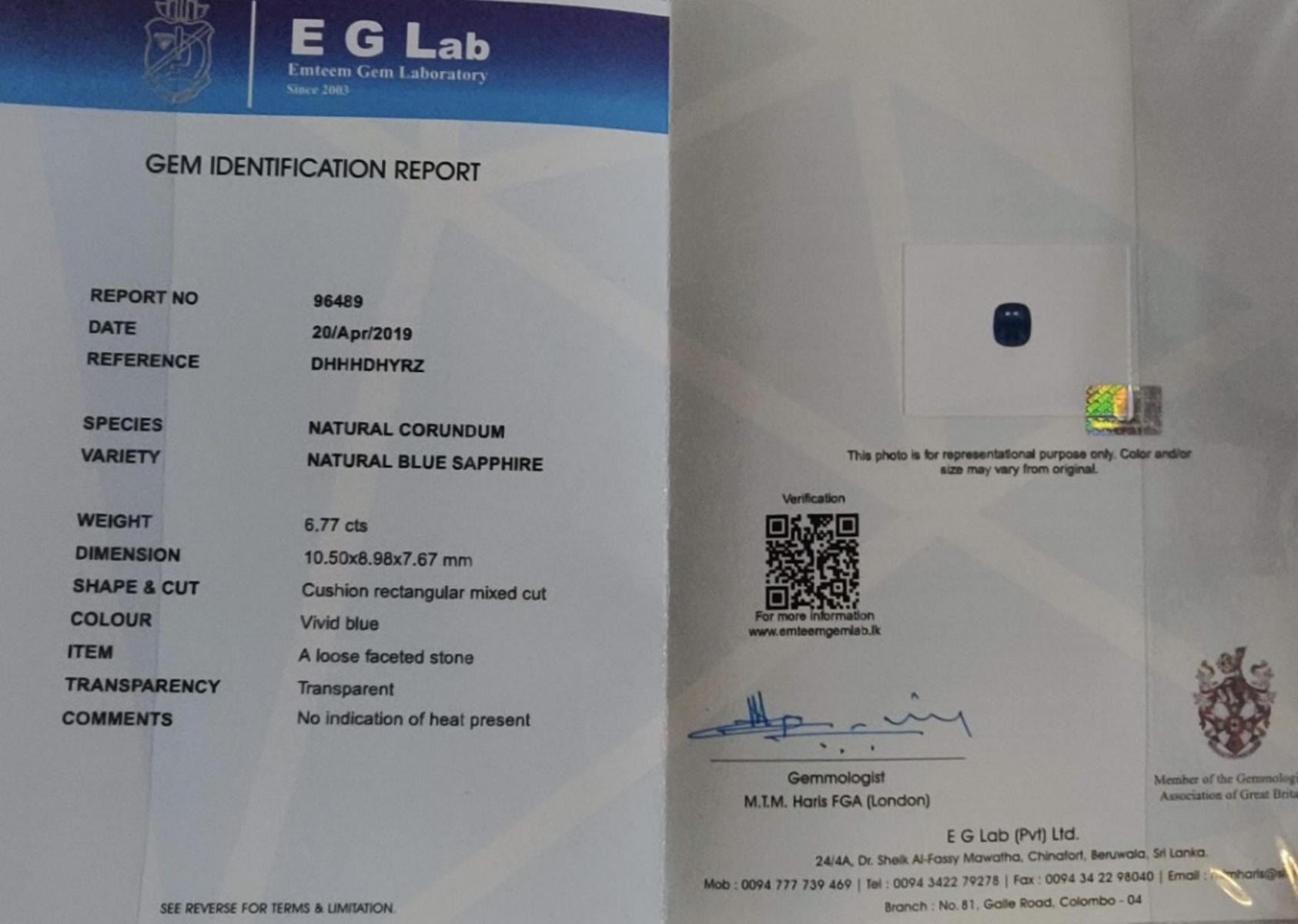 Natural Untreated Vivid Blue (Intense Royal Blue) Cushion Sapphire 6.73 Cts. Size 10.50 x 8.98 x 7.67 MM; Completely untretaed/ free from any kind of treatment. Stone was recut from 6.77 carats to 6.73 carats to remove one bottam inclusion. Stone is eye clean now. Origin - Sri Lanka