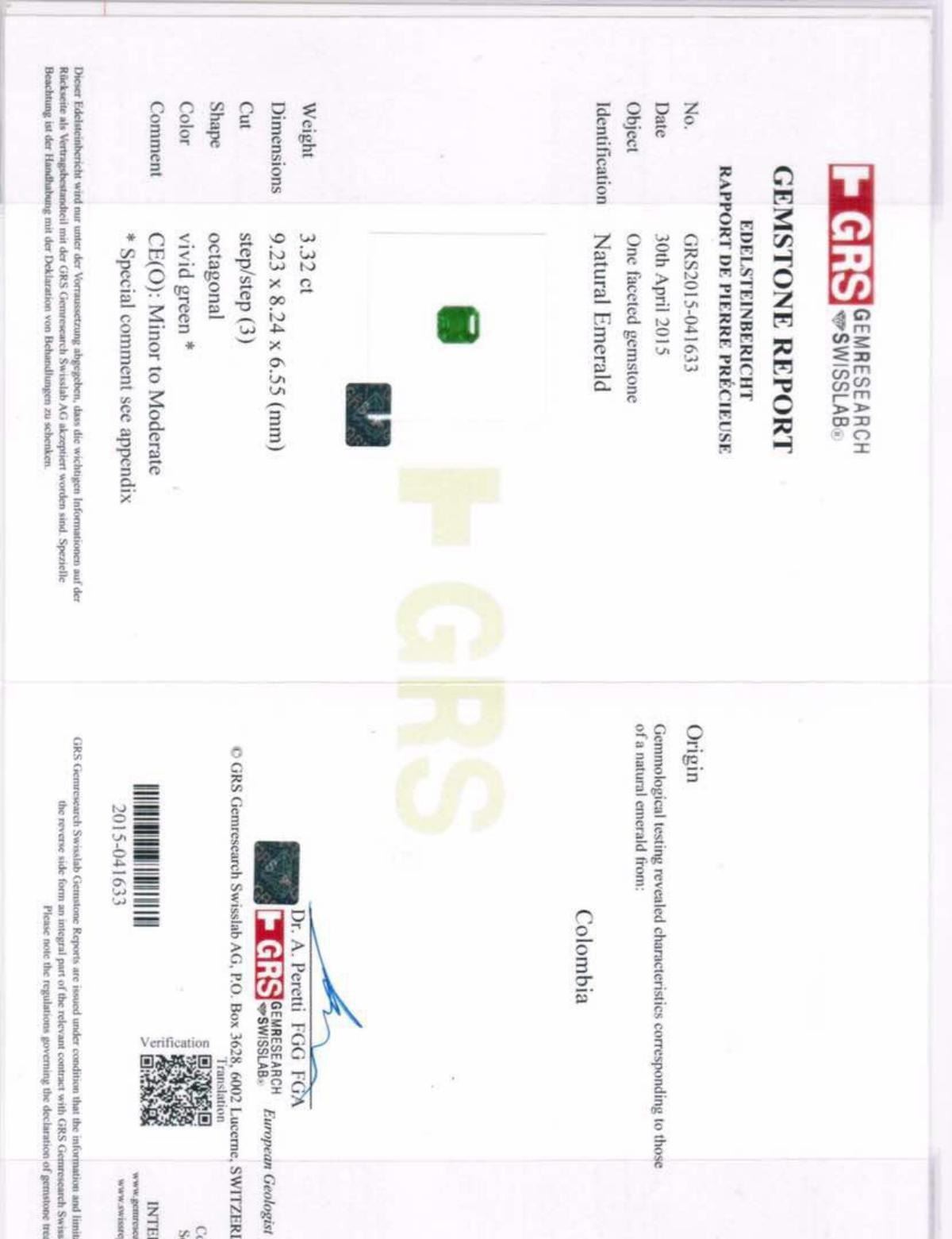 Natural Vivid Green Columbian Emerald 3.32 Cts -Origin -world renowned Muzo Mines Columbia, GRS certified.