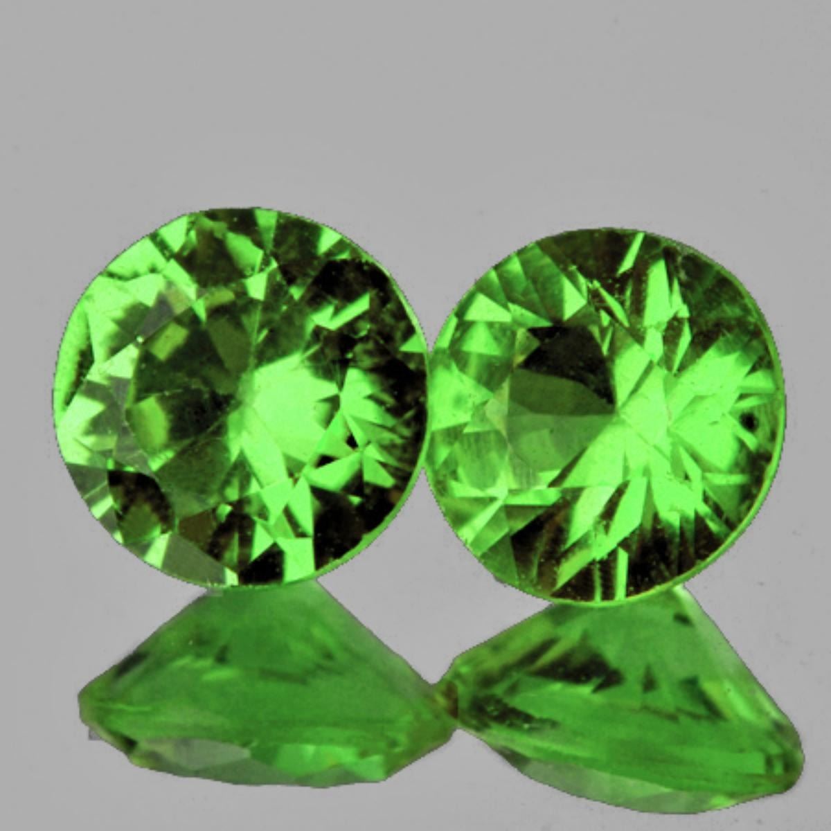 Natural Green Garnet (Tsavorite) WEIGHT : 0.59 cts; SHAPE : Round (Diamond Cut) SIZE ( L x W x D ) : 4.50 mm; QUANTITY : 2 pieces ( Perfectly Matched Pair) COLOR : Vivid Green ; CLARITY : VVS; ORIGIN : Tanzania; HARDNESS : 7; LUSTER : Excellent TREATMENT : 100% Natural Unheated;