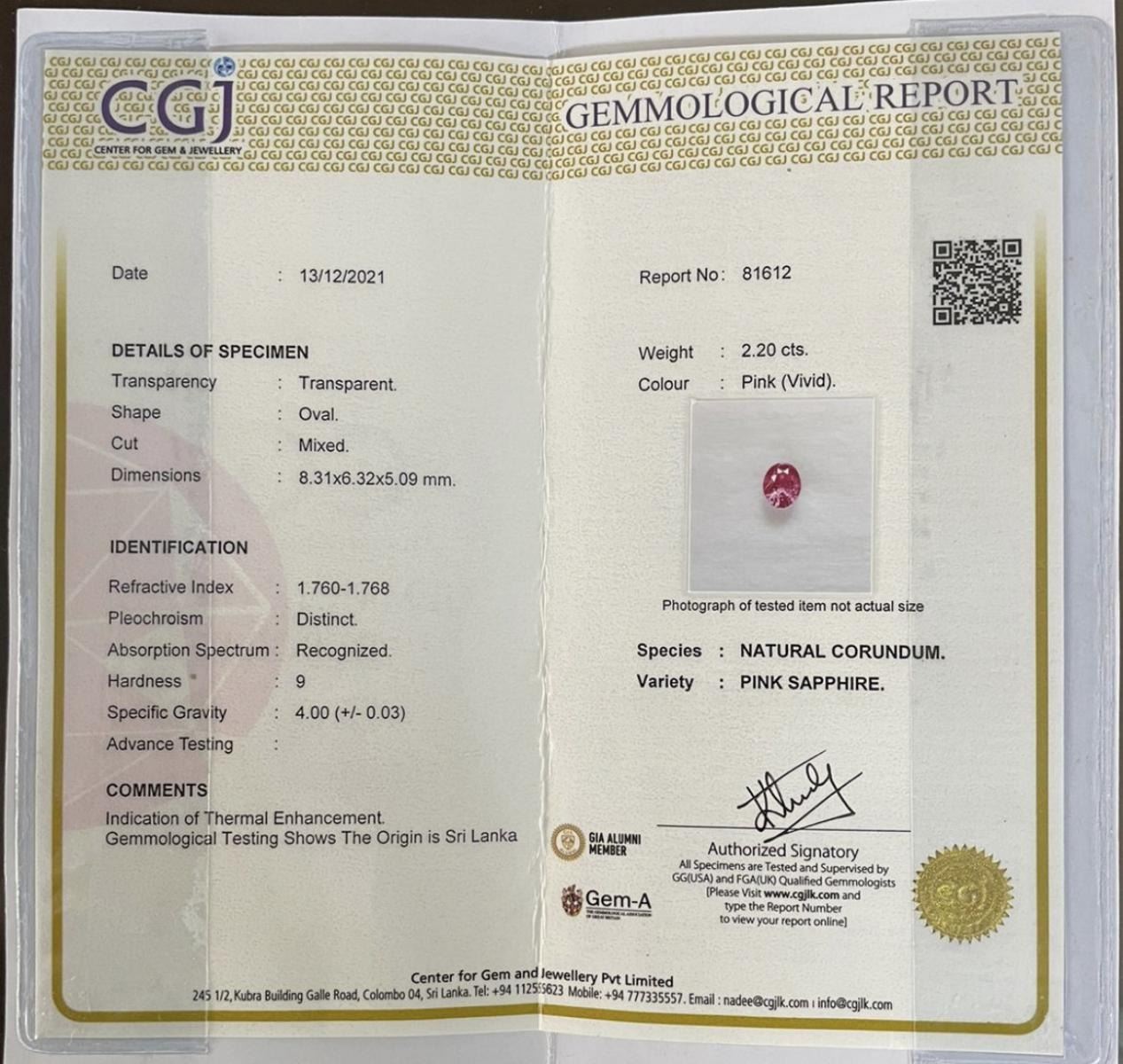 Natural Vivid Pink Sapphire 2.20 Cts - VS......shape - Oval ; size 8.31 x 6.32 x 5.09 MM; Origin - Sri Lanka ; Gently heated only...top luster fire
