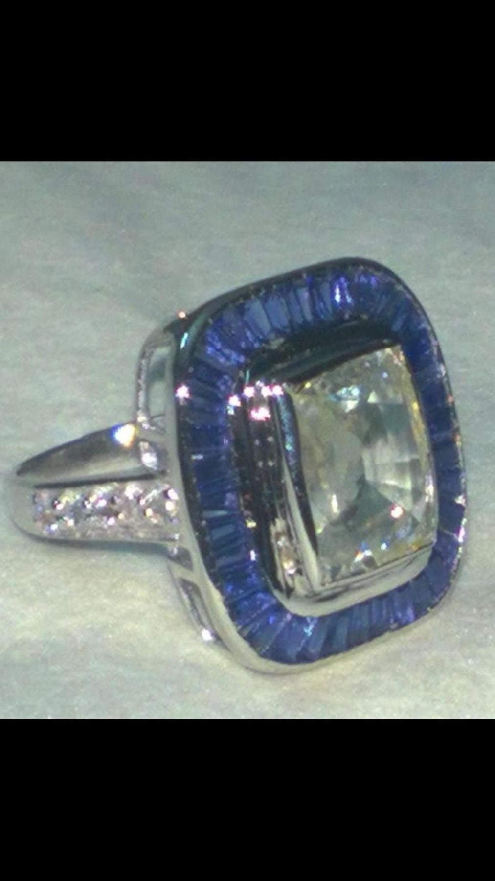 14k White gold 6.5 Grams.....size 6.75; Natural White Sapphire 3.60 Carats....cushion cut....completely untreated; Blue Sapphire - 0.80Cts; White Topaz 0.20 carats;