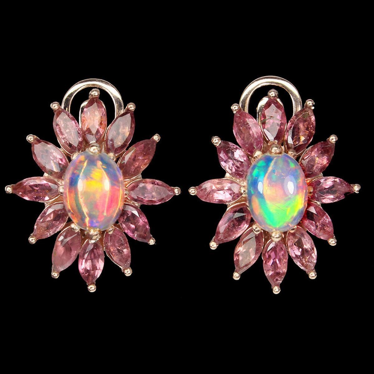925 STERLING SILVER;;PLATE-14K ROSE GOLDMAIN STONE-White OPAL;OTHER GEMS-TOURMALINE;TOTAL WEIGHT-6.92 GRAM (TOTAL WEIGHT OF SILVER + STONE)DIMENSION-* STONE 5.0.X 2.5 TO 8.0 X 6.0 MM. * FACE EARRINGS 21.0 X 18.0 MM.;MAIN STONE SHAPE-OVAL CABOCHON;MAIN STONE COLOR-RAINBOW FULL FLASH;TREATMENT-UNHEATED;ORIGIN-ETHIOPIA;HARDNESS-5.5 - 6.5;