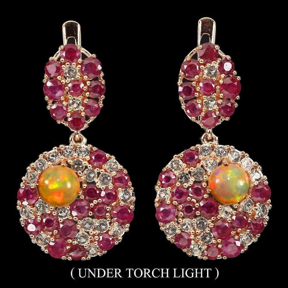 925 STERLING SILVER;PLATE-14K ROSE GOLD;MAIN STONE-FIRE OPAL;OTHER GEMS-- RUBY;TOTAL WEIGHT-8.17 GRAM (TOTAL WEIGHT OF SILVER + STONE)DIMENSION-* STONE 2.5 TO 6.0 MM. * CZ 2.0 MM. * FACE EARRINGS 32.0 X 17.0 MM.;MAIN STONE SHAPE-ROUND CABOCHON;MAIN STONE COLOR-RAINBOW FULL FLASH;TREATMENT-- Yes;ORIGIN-ETHIOPIA;HARDNESS-5;