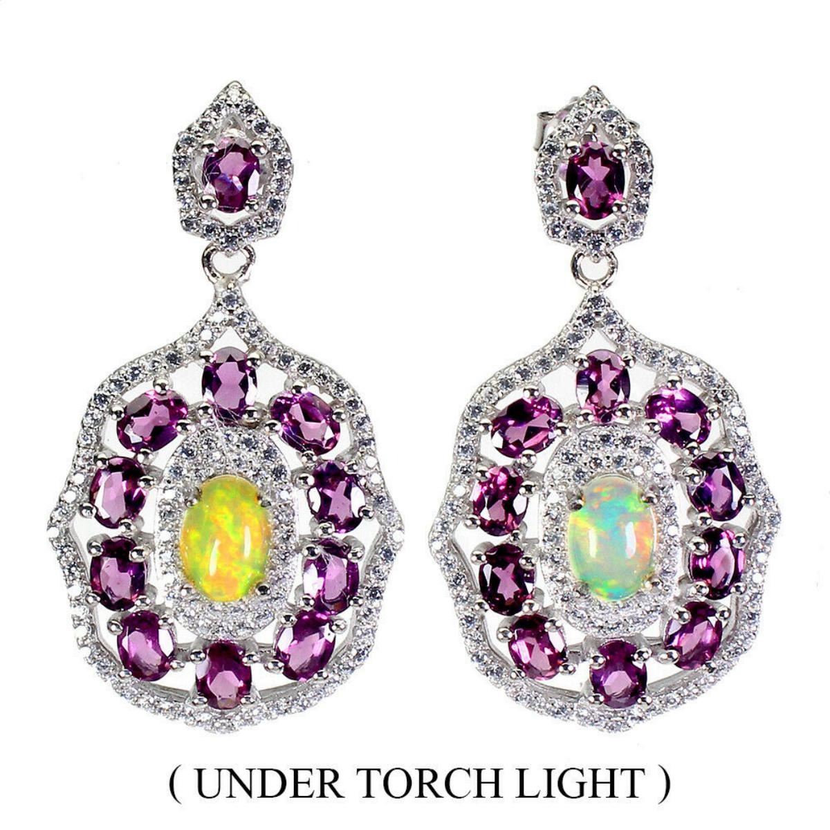 925 STERLING SILVER;PLATE-14K WHITE GOLD;MAIN STONE-White OPAL;OTHER GEMS-- RHODOLITE GARNET;TOTAL WEIGHT-8.66 GRAM (TOTAL WEIGHT OF SILVER + STONE)DIMENSION-* STONE 4.0 X 3.0 TO 7.0 X 5.0 MM. * CZ 1.0 MM. * FACE EARRINGS- 36.0 X 20.0 MM.;MAIN STONE SHAPE-OVAL CABOCHON;TREATMENT-UNHEATED;ORIGIN-ETHIOPIA;HARDNESS-5.5 - 6.5;