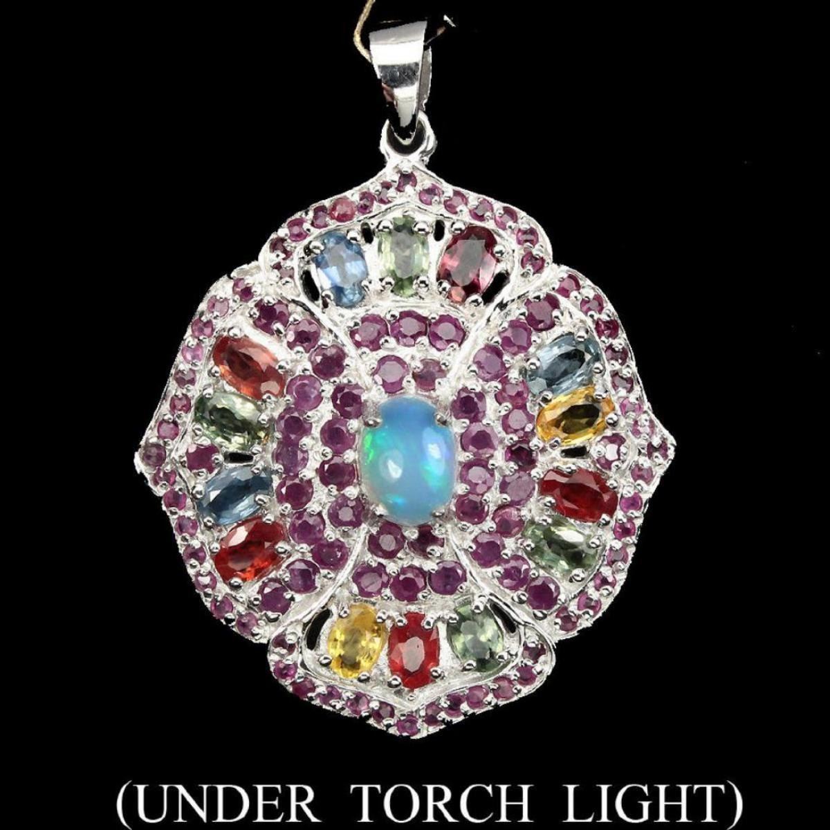 925 STERLING SILVER; PLATE -14K WHITE GOLD; MAIN STONE -FIRE OPAL; OTHER GEMS -RUBY,SAPPHIRE; TOTAL WEIGHT 48.49 CT (TOTAL WEIGHT OF SILVER + STONE) DIMENSION * STONE 1.0 TO 8.0 X 6.0 MM. * FACE PENDANT 45.0 X 34.0 MM. ; MAIN STONE COLOR -MULTI-COLOR; CLARITY/GRADE -TRANSPARENT; TREATMENT -UNHEATED; ORIGIN -ETHIOPIA