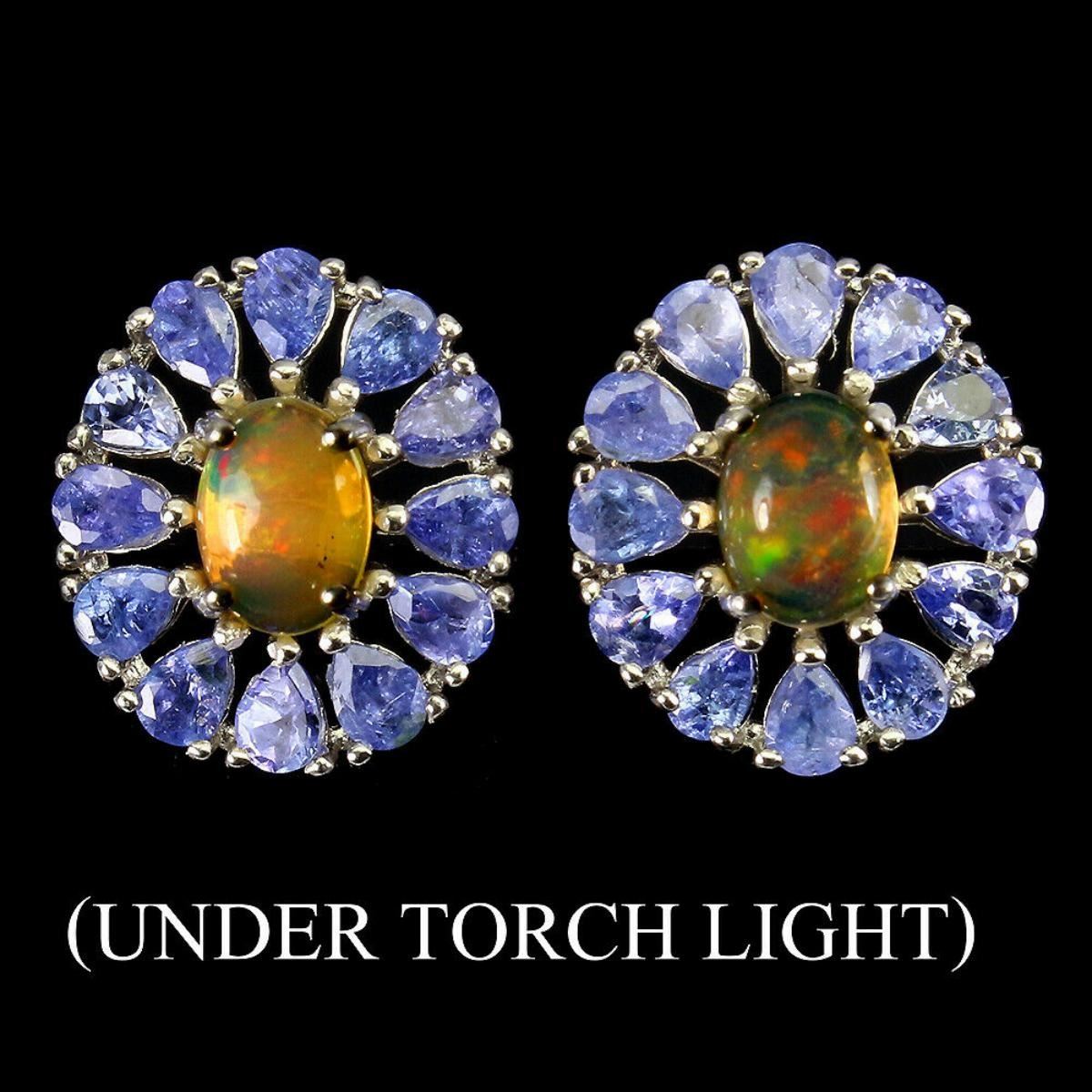 925 STERLING SILVER;PLATE-14K WHITE GOLD;MAIN STONE-FIRE OPAL;OTHER GEMS-TANZANITE;TOTAL WEIGHT-6 GRAM (TOTAL WEIGHT OF SILVER + STONE)DIMENSION-* STONE 4.0 X 3.0 TO 8.0 X 6.0 MM. * FACE EARRINGS 18.0 X 16.0 MM.;MAIN STONE SHAPE-OVAL CABOCHON;MAIN STONE COLOR-RAINBOW FULL FLASH;TREATMENT-UNHEATED;ORIGIN-ETHIOPIA;HARDNESS-5.5 - 6.5;