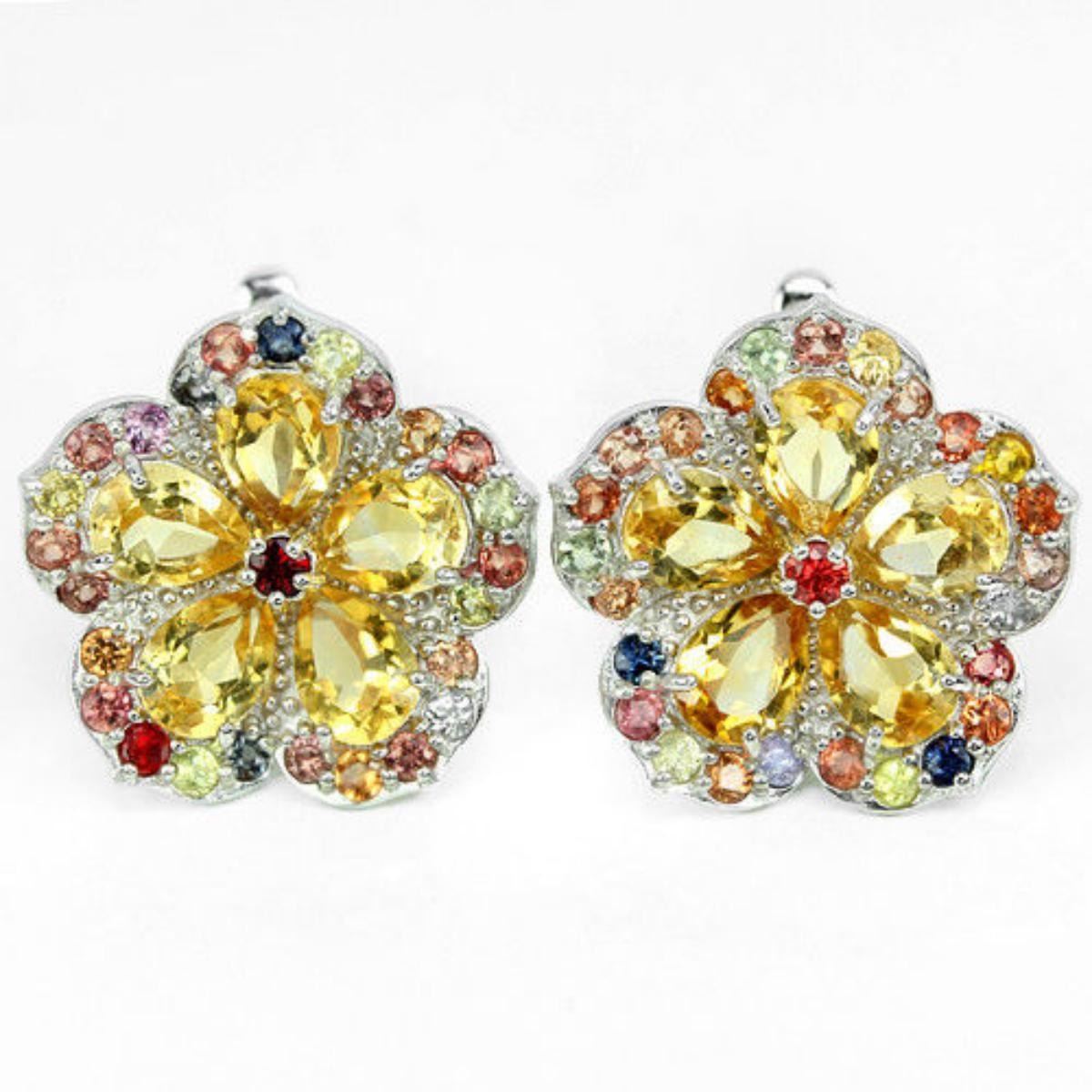 GENUINE CITRINE MULTI COLOR SAPPHIRE 925 SILVER EARRING 14K WHITE GOLD COATING; STONE SHAPE PEAR ROUND STONE DIMENSION 7 X 5 MM. , 2.5 MM. , 2 MM. ITEM WEIGHT 8.4 GRAM COLOR MULTI COLOR CLARITY VVS-SI TRANSLUCENT LUSTER BEAUTEOUS TREATMENT NATURAL UNHEATED ORIGIN OF STONE BRAZIL, AFRICA THAILAND HARDNESS 7 - 9 ; FACE OF EARRING 21 X 21 MM.