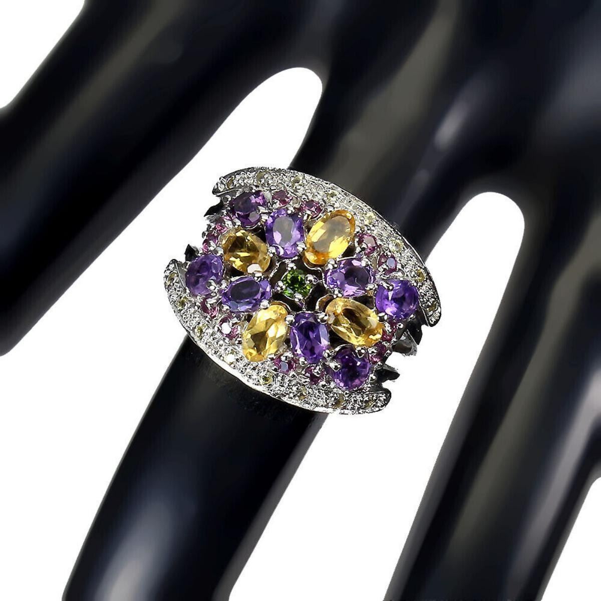 925 STERLING SILVER;PLATE-14K WHITE GOLD;RING SIZE/resizable-7;MAIN STONE-CITRINE;OTHER GEMS-AMETHYST, CHROME DIOPSIDE, RHODOLITE GARNET, SAPPHIRE;TOTAL WEIGHT-5.05 GRAM (TOTAL WEIGHT OF SILVER + STONE)DIMENSION-* STONE 1.0 TO 5.0 X 3.0 MM.;* FACE RING -22.0 X 18.0 MM.;MAIN STONE SHAPE-OVAL CUT;MAIN STONE COLOR-TOP RICH YELLOW;CLARITY/GRADE-IF TO VVS;TREATMENTUNHEATED;ORIGIN-BRAZIL;HARDNESS-7;