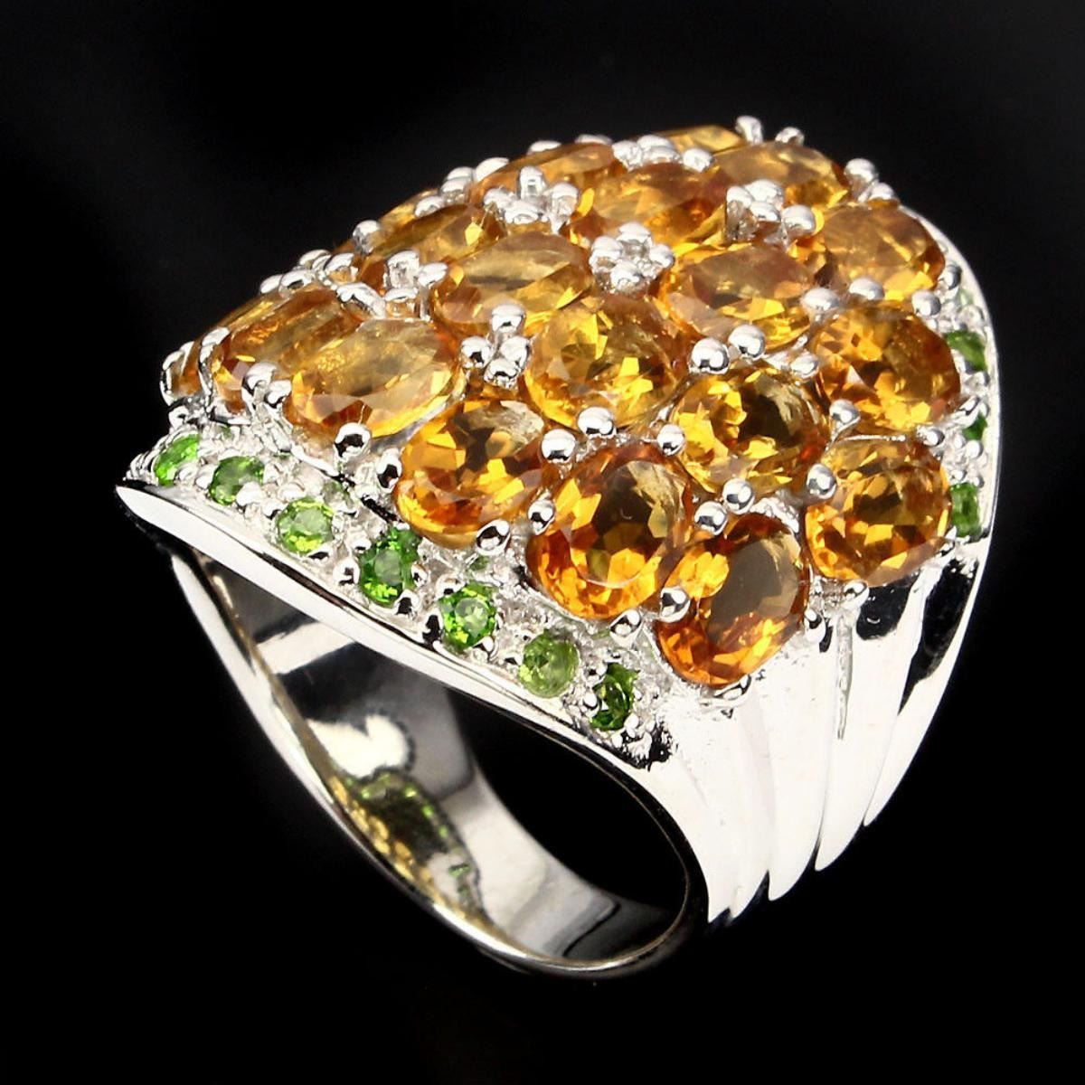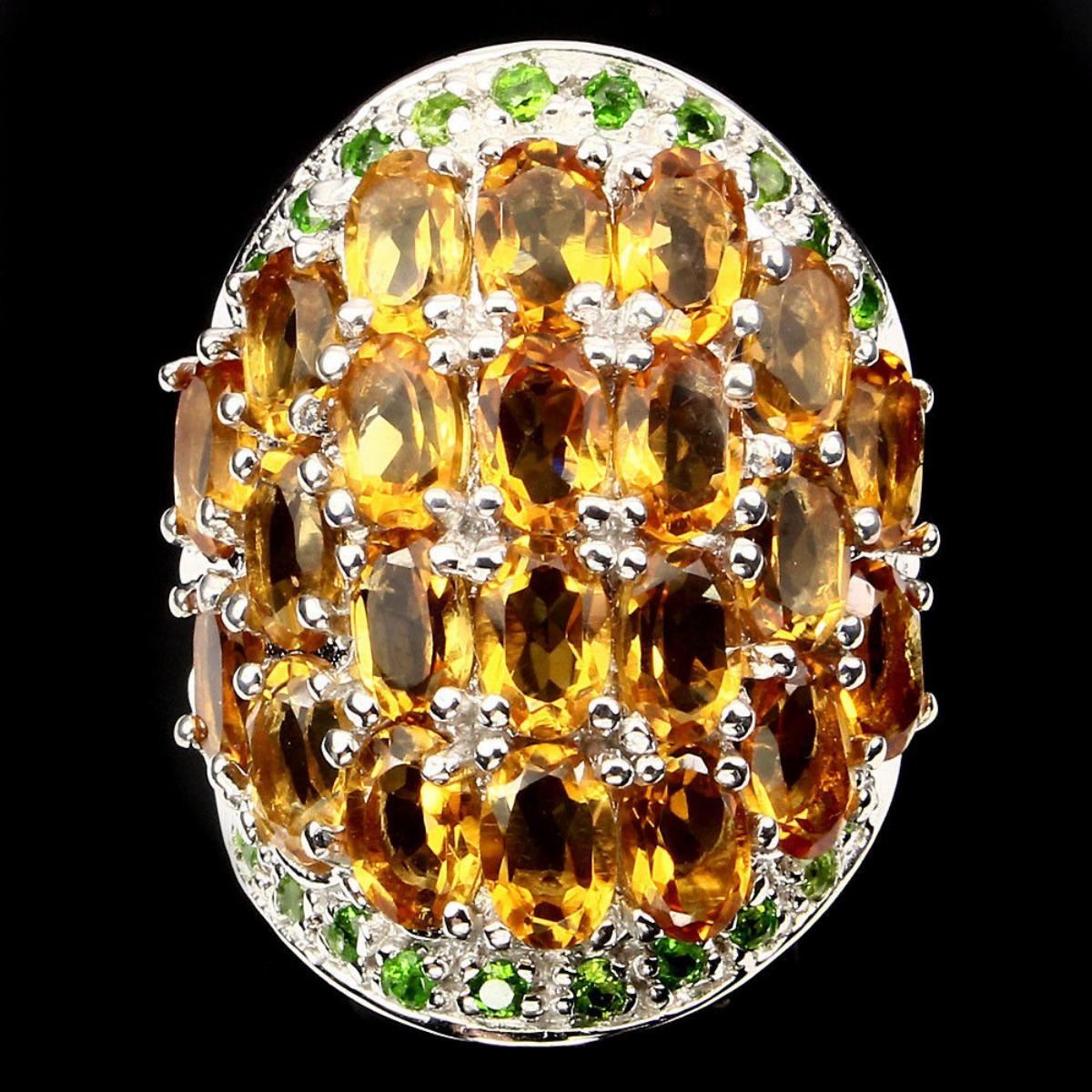 925 STERLING SILVER; PLATE -14K WHITE GOLD; RING SIZE - 7.5; MAIN STONE- CITRINE;; OTHER GEMS -CHROME DIOPSIDE; TOTAL WEIGHT -82.36 CT (TOTAL WEIGHT OF SILVER + STONE) DIMENSION * STONE 2.0 TO 6.0 X 4.0 MM. * RING 7.5 SIZE * FACE RING 30.0 X 23.0 MM.; MAIN STONE SHAPE -OVAL CUT; MAIN STONE COLOR -TOP RICH YELLOW; CLARITY/GRADE -IF TO VVS; LUSTER -CHARMING; TREATMENT -UNHEATED; ORIGIN -BRAZIL