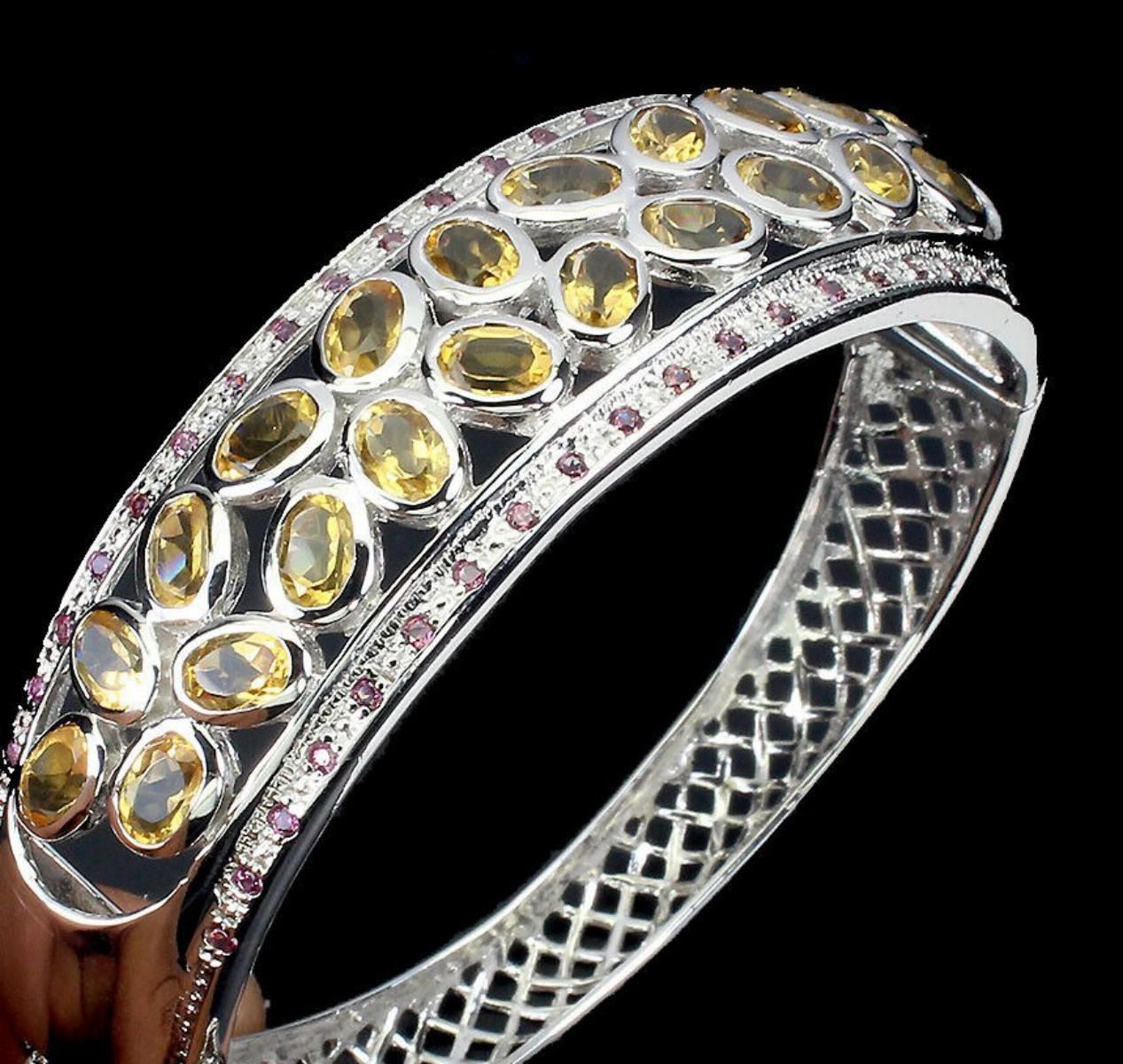 925 STERLING SILVER;PLATE-14K WHITE GOLD;MAIN STONE-CITRINE;OTHER GEMS-RHODOLITE GARNET;TOTAL WEIGHT-35.37 GRAM (TOTAL WEIGHT OF SILVER + STONE);DIMENSION-* STONE 1.5 TO 6.0 X 4.0 MM.* DIAMETER 2.2 X 1.9 INCHES.* FACE BANGLE 64.0 X 20.0 MM.;MAIN STONE SHAPE-OVAL; MAIN STONE COLOR-YELLOW;CLARITY/GRADE-IF TO VVS;TREATMENT-UNHEATED;ORIGIN-BRAZIL;HARDNESS-7;