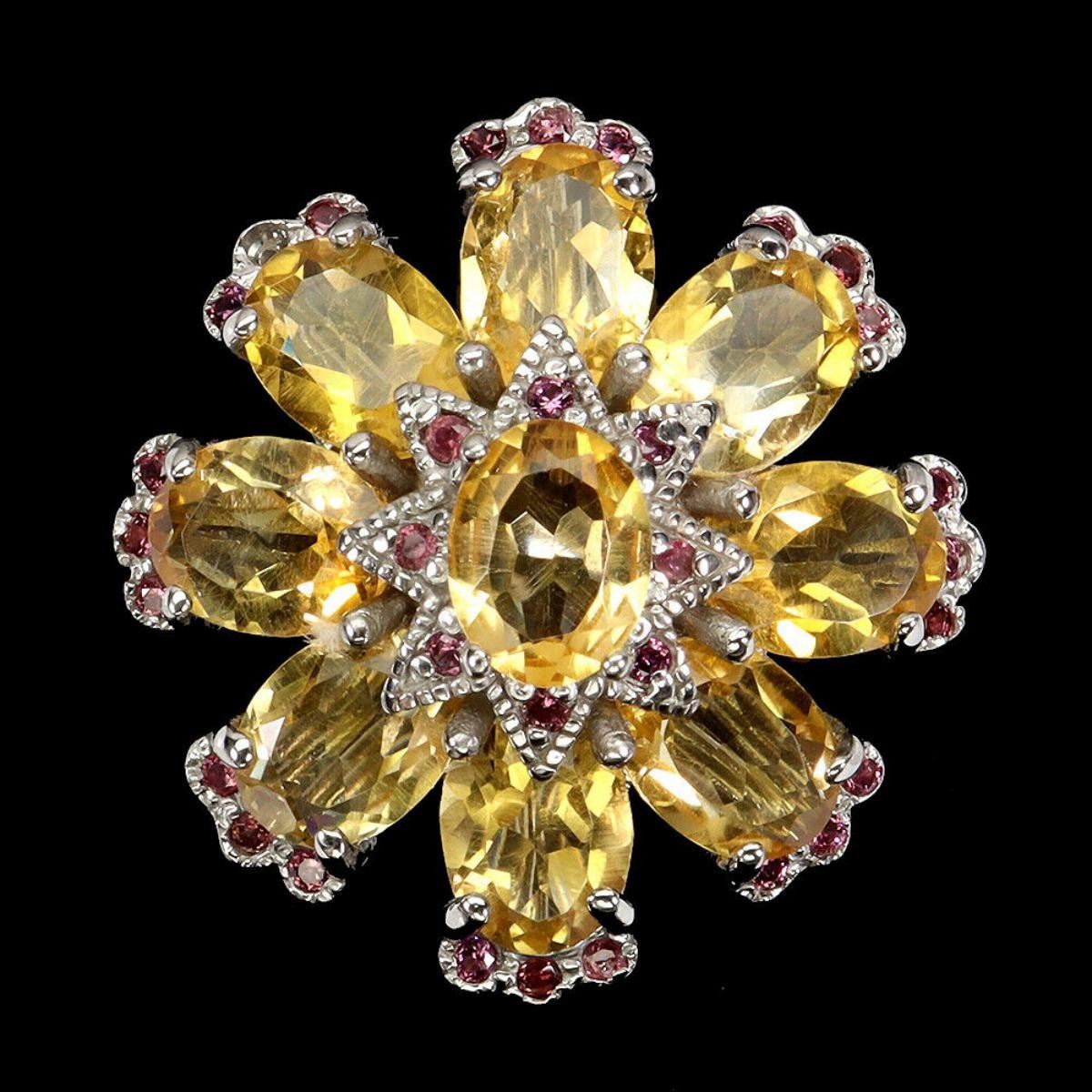 925 STERLING SILVER;PLATE-14K WHITE GOLD;RING SIZE/resizable-9.5;MAIN STONE-CITRINE;OTHER GEMS-RHODOLITE GARNET;TOTAL WEIGHT-11.39 GRAM (TOTAL WEIGHT OF SILVER + STONE)DIMENSION-* STONE 1.0 TO 8.0 X 6.0 MM.;* RING SIZE- 9.5;* FACE RING -28.0 X 27.0 MM.;MAIN STONE SHAPE-OVAL CUT;MAIN STONE COLOR-TOP RICH YELLOW;CLARITY/GRADE-IF;TREATMENT-UNHEATED;ORIGIN-BRAZIL;HARDNESS-7;