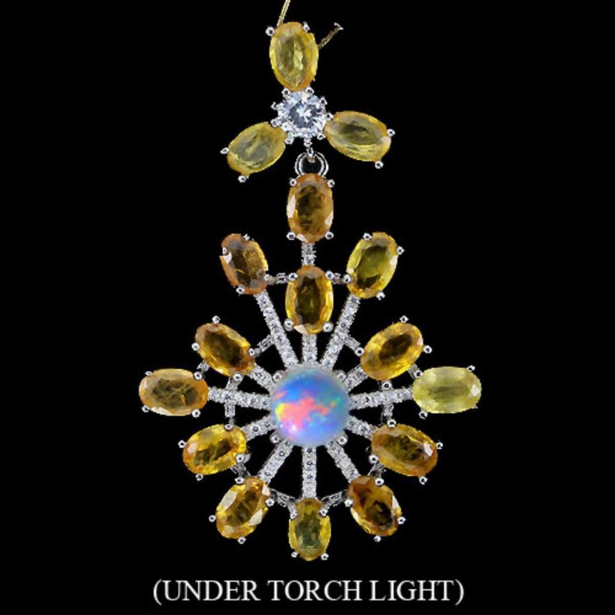 OPAL, SAPPHIRE (NATURAL) 14K WHITE GOLD COATING 925 SILVER PENDANT;WEIGHT (CT.):39.20 CT. (total weight of silver + stone)DIMENSION:* STONE 6.0 X 4.0 TO 7.0 MM. * CZ 1.0 TO 5.0 ; MM. ;* FACE PENDANT 48.0 X 30.0 MM.;SHAPE/CUT:ROUND CABOCHON, OVAL FACET & ROUND DIAMOND CUT;COLOR:HOT RAINBOW LUSTER, TOP RICH YELLOW & AAA WHITE;CLARITY/GRADE:TRANSPARENT & IF TO VVS;LUSTER:FANTASTIC; TREATMENT:UNHEATED & HEATED; ORIGIN:ETHIOPIA & SONGEA - AFRICA; HARDNESS : 5.5 - 9.0