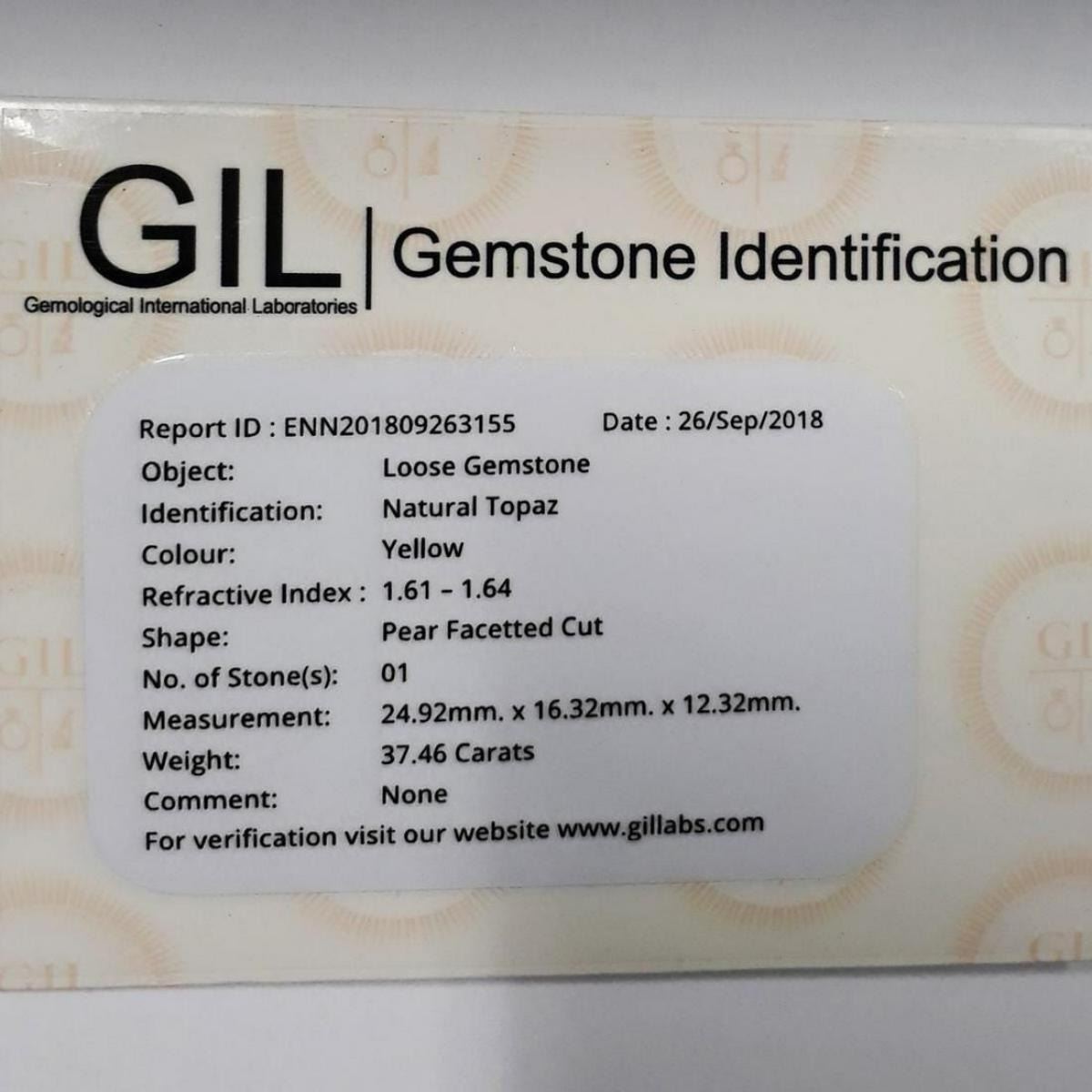 Natural Topaz WEIGHT : 37.46 cts; SHAPE : Pear; SIZE ( L x W x D ) : 24.92 x 16.32 x 12.32 mm; QUANTITY : 1 piece; COLOR : Light Yellow (Natural Color) CLARITY : Flawless-VVS1 AAA Grade; ORIGIN : Brazil; HARDNESS : 8; LUSTER : Excellent!!! TREATMENT : Unheated & Untreated 100% Natural