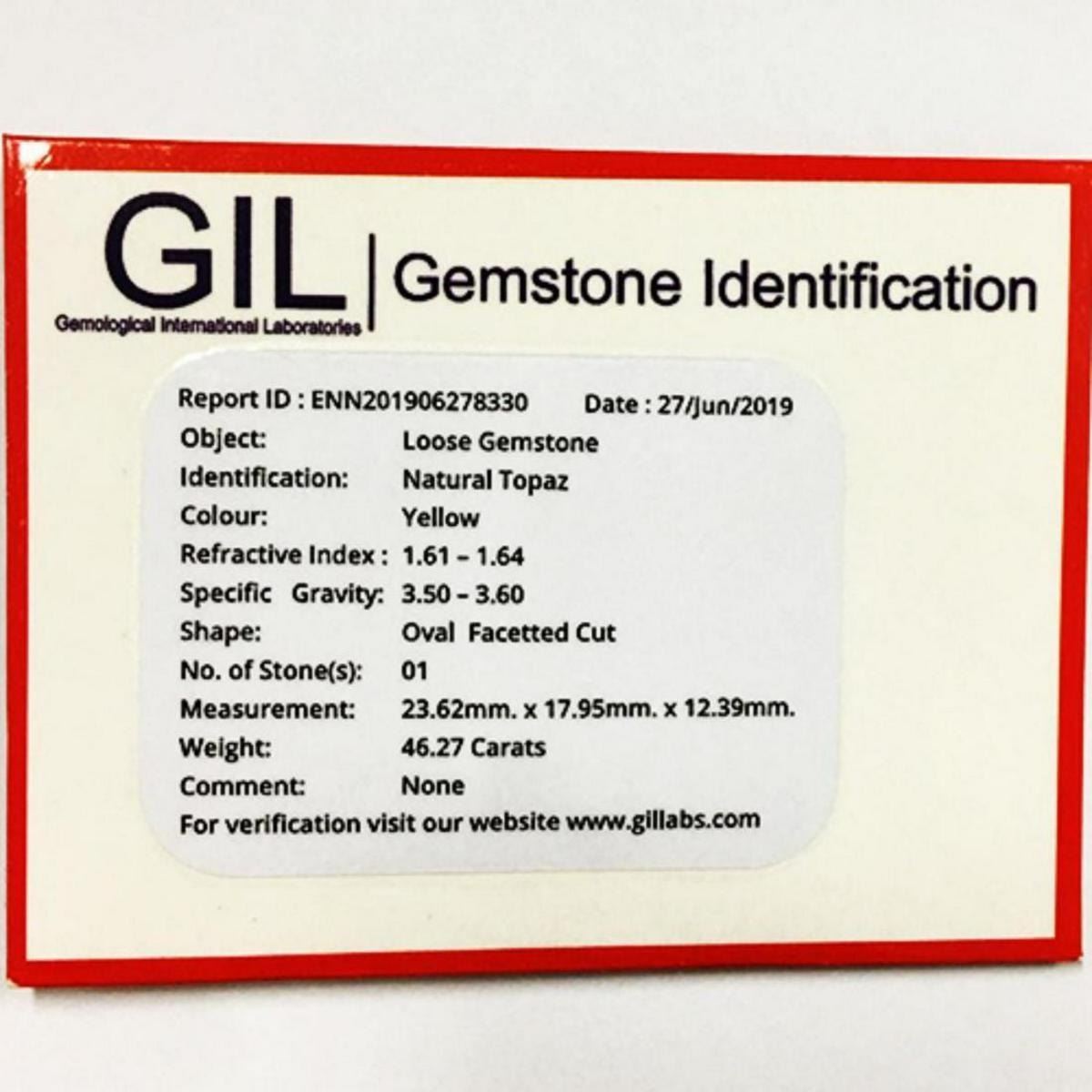 Natural Topaz Certified; WEIGHT : 46.27 cts; SHAPE : Oval SIZE ( L x W x D ) : 23.62 x 17.95 x 12.39 mm QUANTITY : 1 piece COLOR : Yellow (Natural Color) CLARITY : Flawless-VVS1 AAA Grade ORIGIN : Brazil HARDNESS : 8 LUSTER : Excellent!!! TREATMENT : Unheated & Untreated 100% Natural