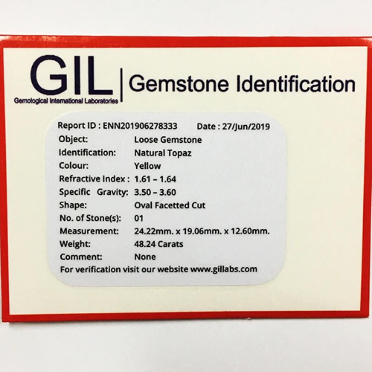 Natural Topaz certified'; WEIGHT : 48.24 cts; SHAPE : Oval SIZE ( L x W x D ) : 24.22 x 19.06 x 12.60 mm QUANTITY : 1 piece COLOR : Yellow (Natural Color) CLARITY : Flawless-VVS1 AAA Grade ORIGIN : Brazil HARDNESS : 8 LUSTER : Excellent!!! TREATMENT : Unheated & Untreated 100% Natural