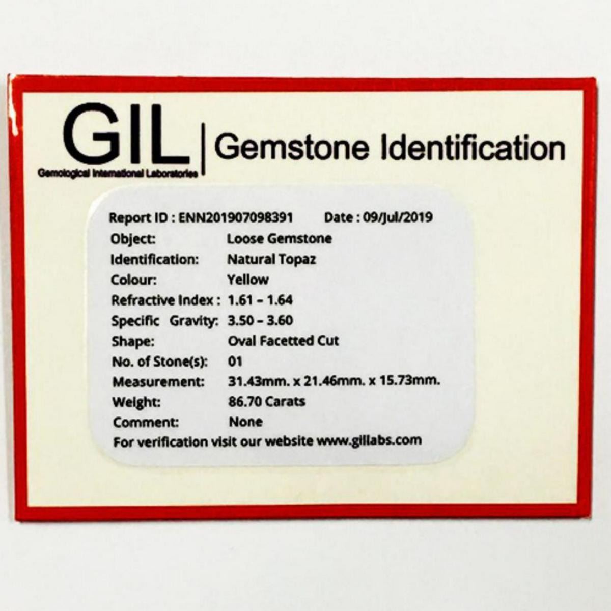 Natural Topaz ....Certified; WEIGHT : 86.70 cts; SHAPE : Oval SIZE ( L x W x D ) : 31.43 x 21.46 x 15.73 mm; QUANTITY : 1 piece; COLOR : Yellow (Natural Color) CLARITY : Flawless-VVS1 AAA Grade; ORIGIN : Brazil; HARDNESS : 8; LUSTER : Excellent!!! TREATMENT : Unheated & Untreated 100% Natural;
