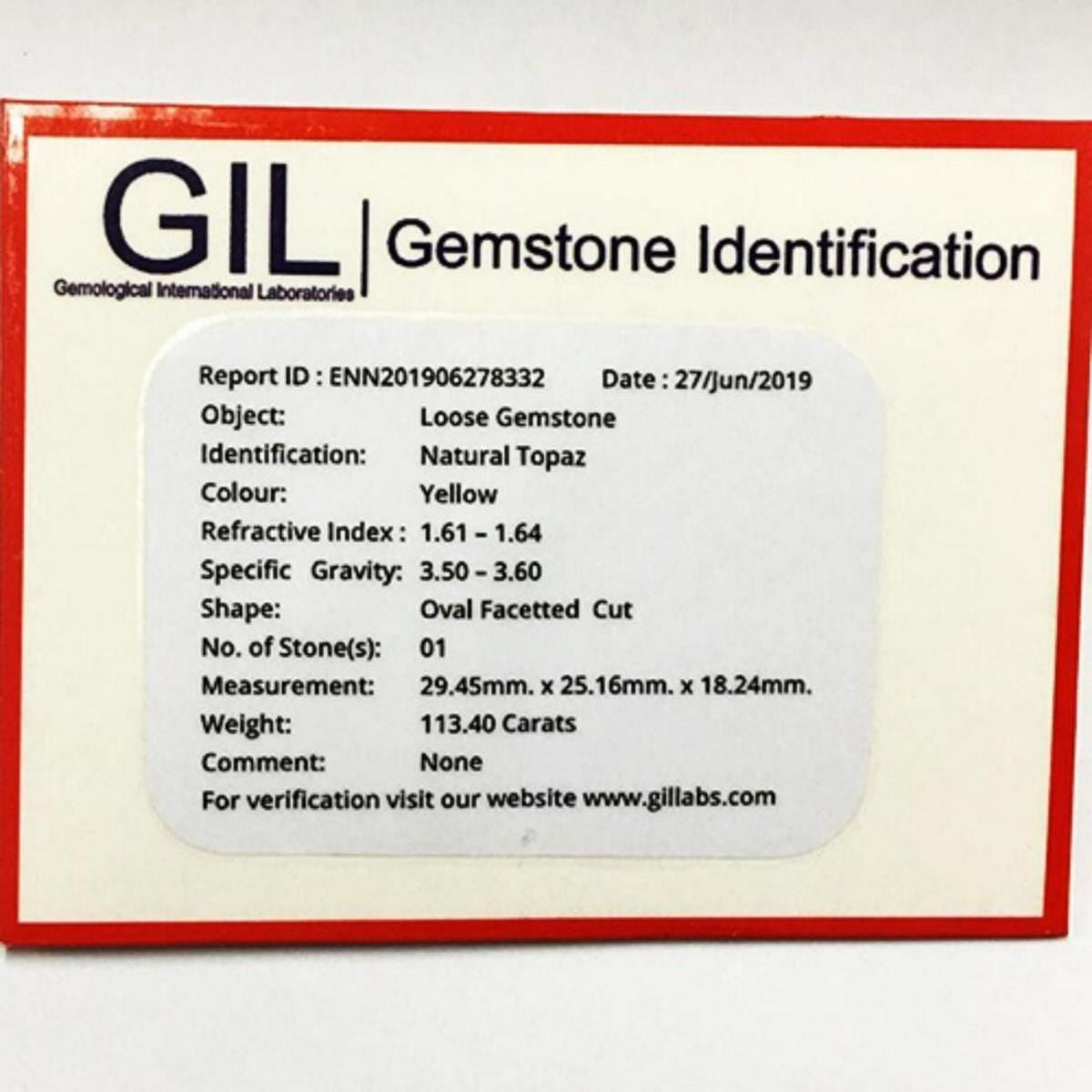 Natural Topaz (Certified) WEIGHT : 113.40 cts; SHAPE : Oval; SIZE ( L x W x D ) : 29.45 x 25.16 x 18.24 mm; QUANTITY : 1 piece; COLOR : Yellow (Natural Color) CLARITY : Flawless-VVS1 AAA Grade; ORIGIN : Brazil; HARDNESS : 8; LUSTER : Excellent!!! TREATMENT : Unheated & Untreated 100% Natural;