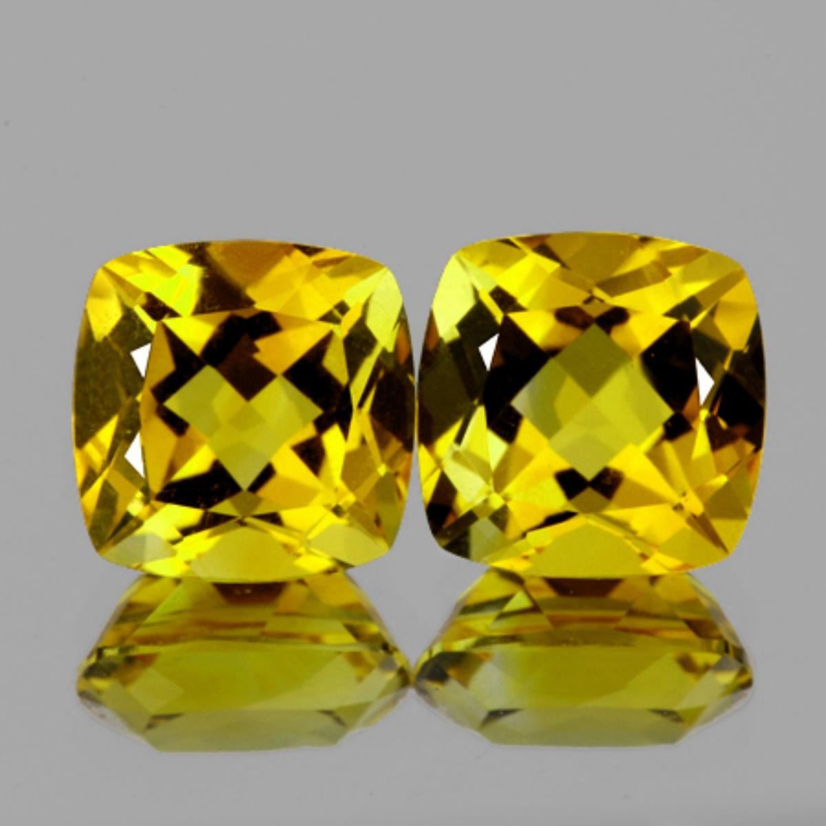Natural Beryl (Heliodoor) WEIGHT : 2.84 cts SHAPE : Cushion SIZE ( L x W x D ) : 7.00 mm QUANTITY : 2 pieces (Perfect Matching Pair) COLOR : Intense Golden Yellow CLARITY : Flawless-VVS1 AAA Grade ORIGIN : Brazil HARDNESS : 7.5 LUSTER : Excellent!!! TREATMENT : 100% Natural Unheated