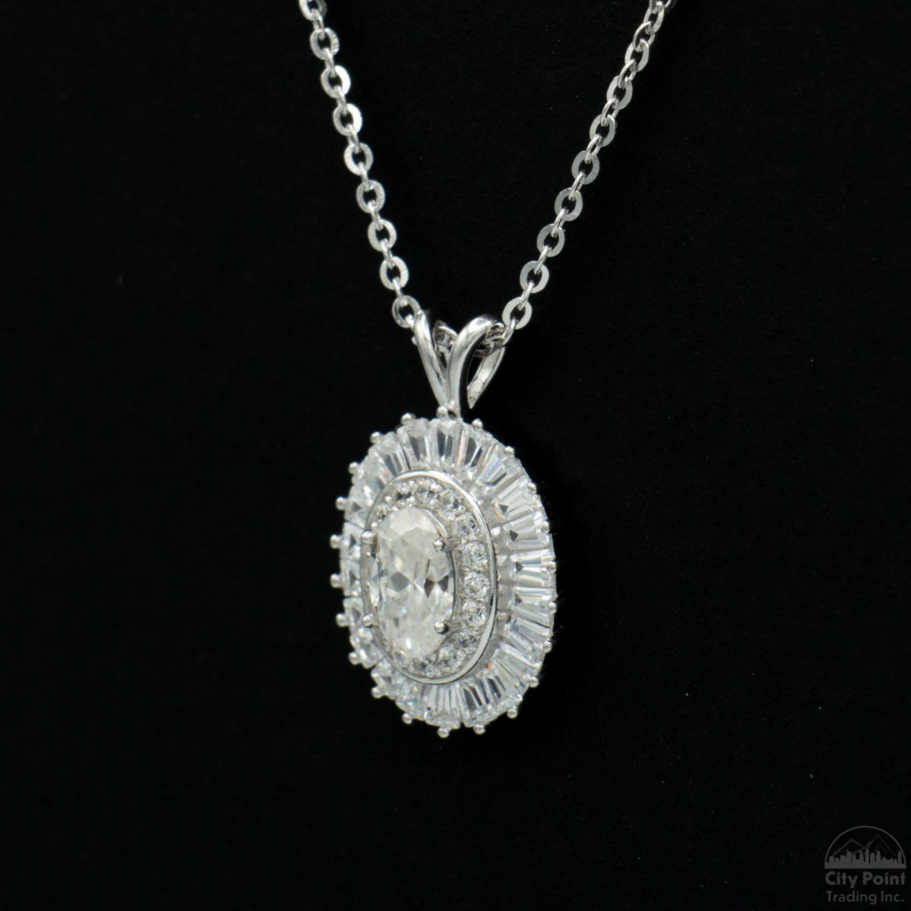 One stamped S925 platinum-plated sterling silver necklace weighing 2.60 grams, featuring a pendant with a single prong-set oval cut moissanite main stone, approximately 0.50 carat. Condition is new. Comes with a box, pouch, and display box.