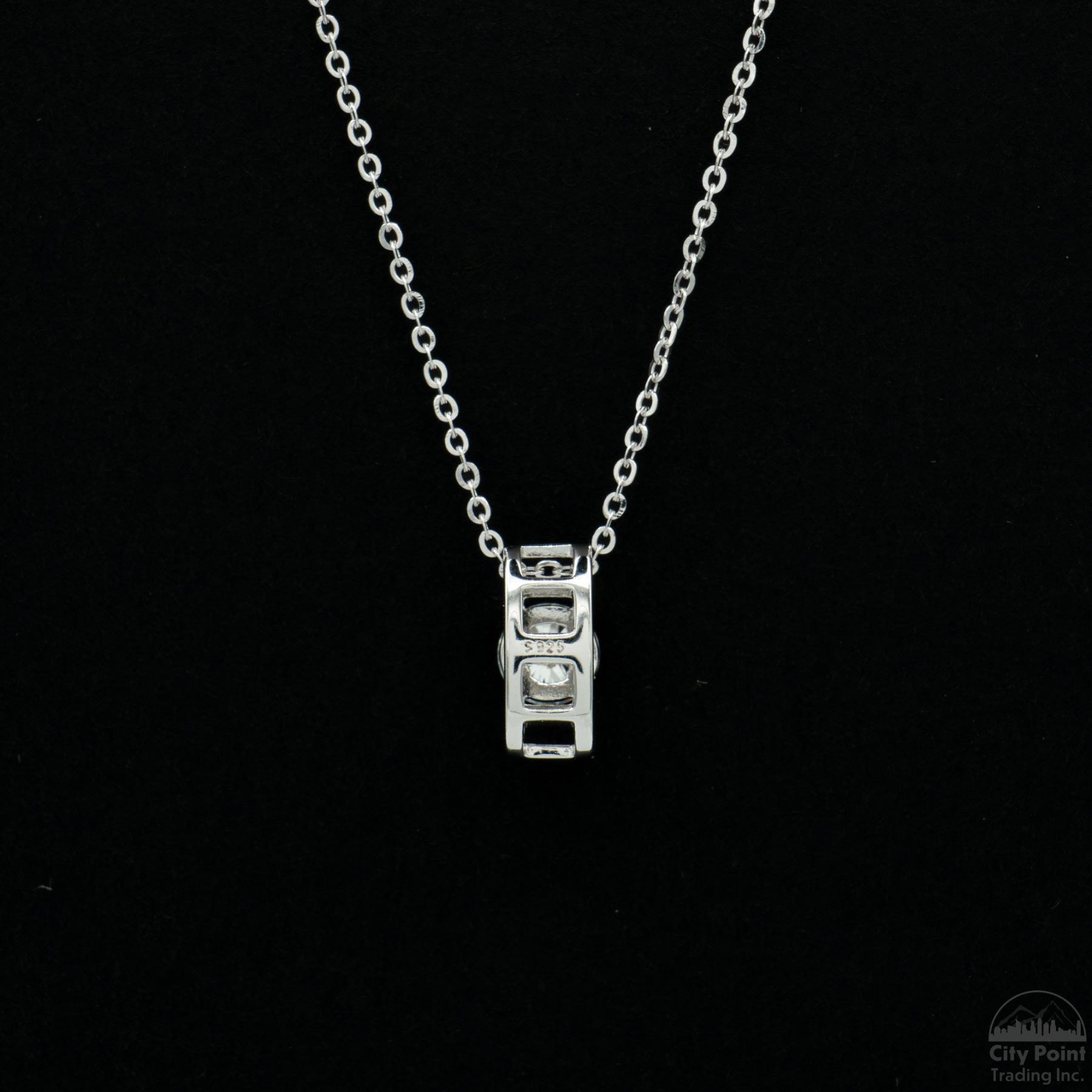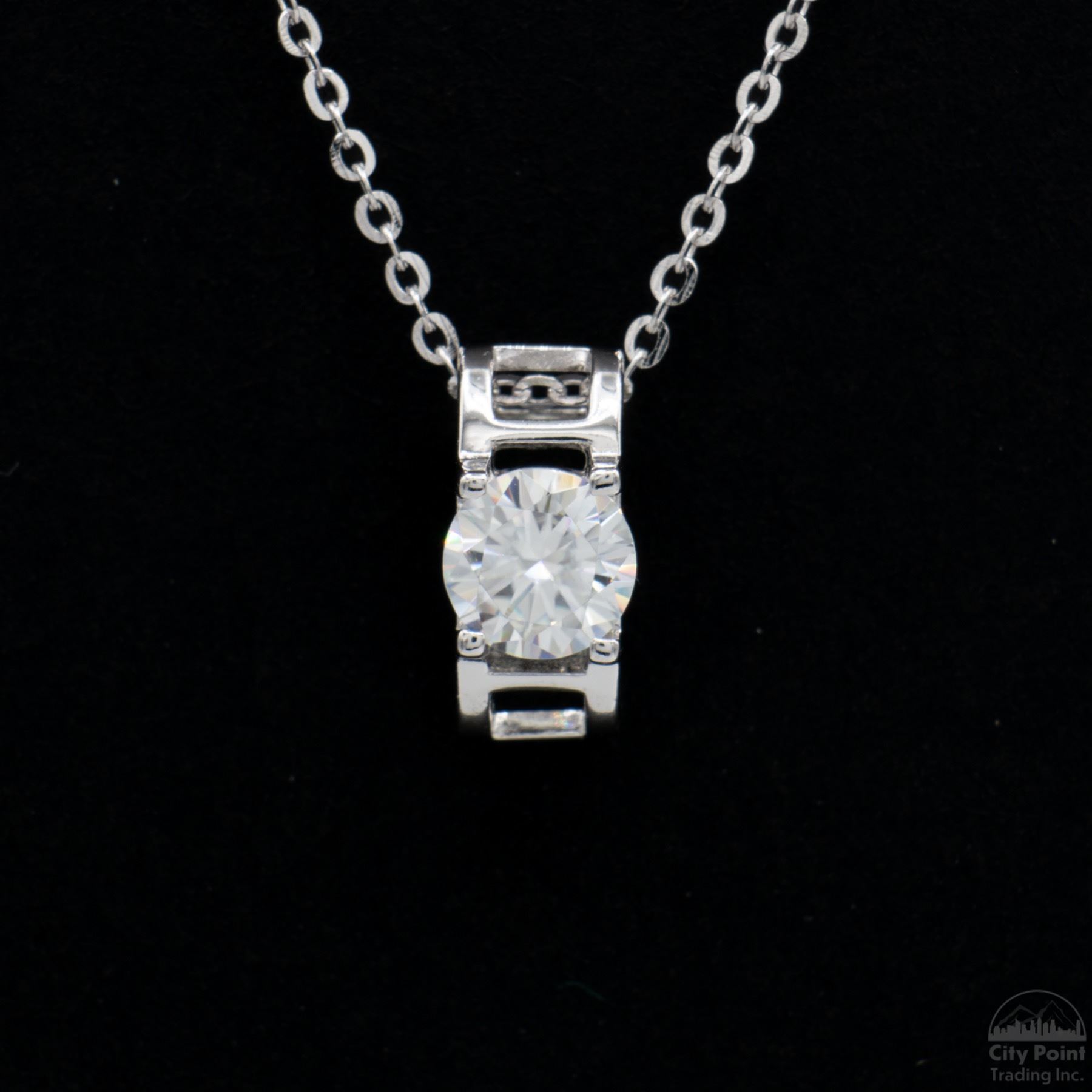 One stamped S925 platinum-plated sterling silver necklace weighing 1.49 grams, featuring a pendant with a single prong-set round cut moissanite, approximately 0.50 carat. Condition is new. Comes with a box, pouch, and display box.