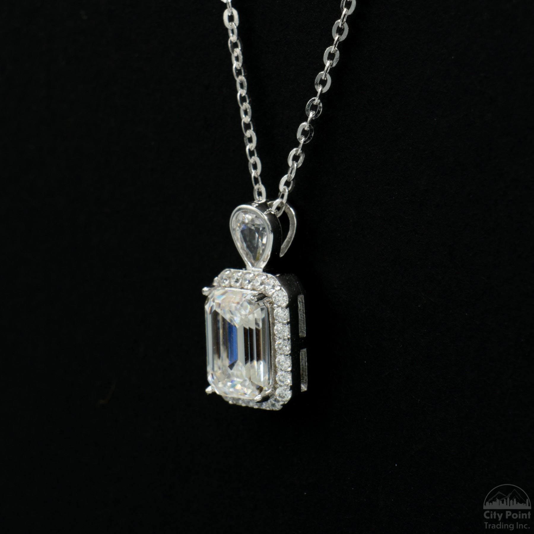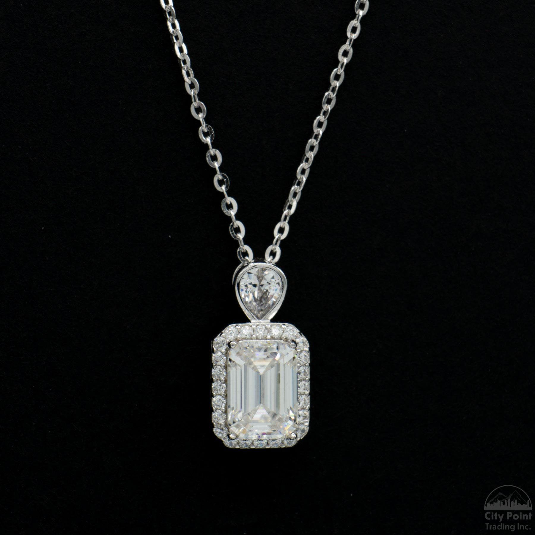 One stamped S925 platinum-plated sterling silver necklace weighing 1.85 grams, featuring a pendant with a single prong-set 1.20 carat emerald cut moissanite main stone, surrounded by pave-set moissanite. The pendant also includes one bezel-set 0.20 carat pear cut moissanite side stone. Condition is new. Comes with a box, pouch, and display box.