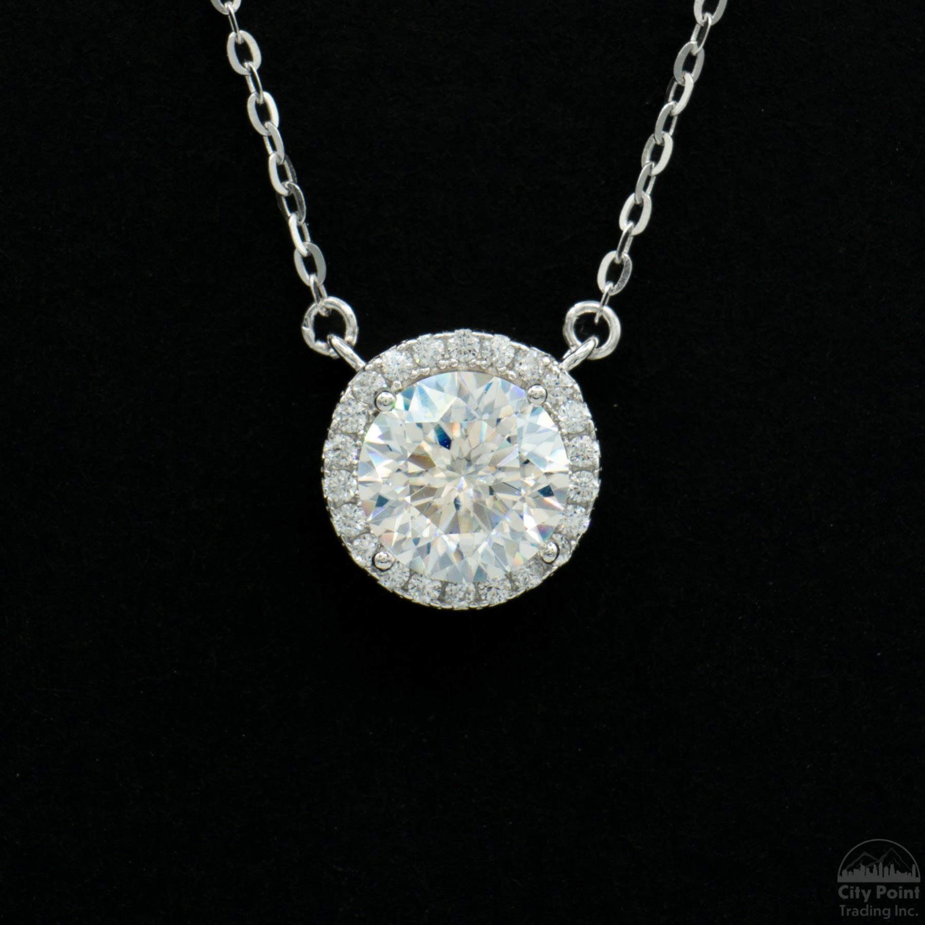 One stamped S925 platinum-plated sterling silver necklace weighing 2.39 grams, featuring a pendant with a single prong-set round cut moissanite main stone, approximately 1.20 carats, surrounded by pave-set moissanite. Condition is new. Comes with a box, pouch, and display box.