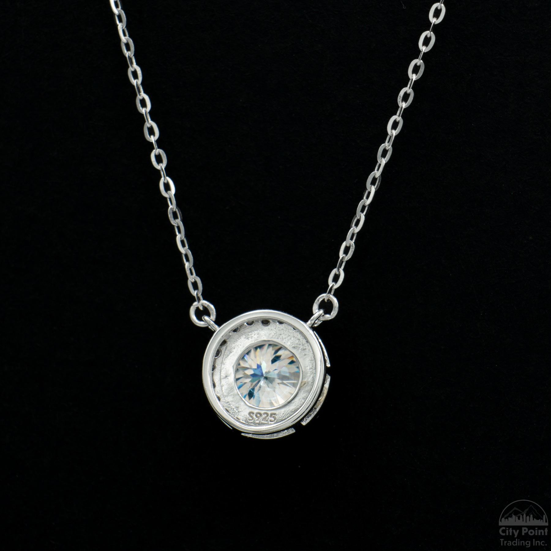 One stamped S925 platinum-plated sterling silver necklace weighing 2.39 grams, featuring a pendant with a single prong-set round cut moissanite main stone, approximately 1.20 carats, surrounded by pave-set moissanite. Condition is new. Comes with a box, pouch, and display box.