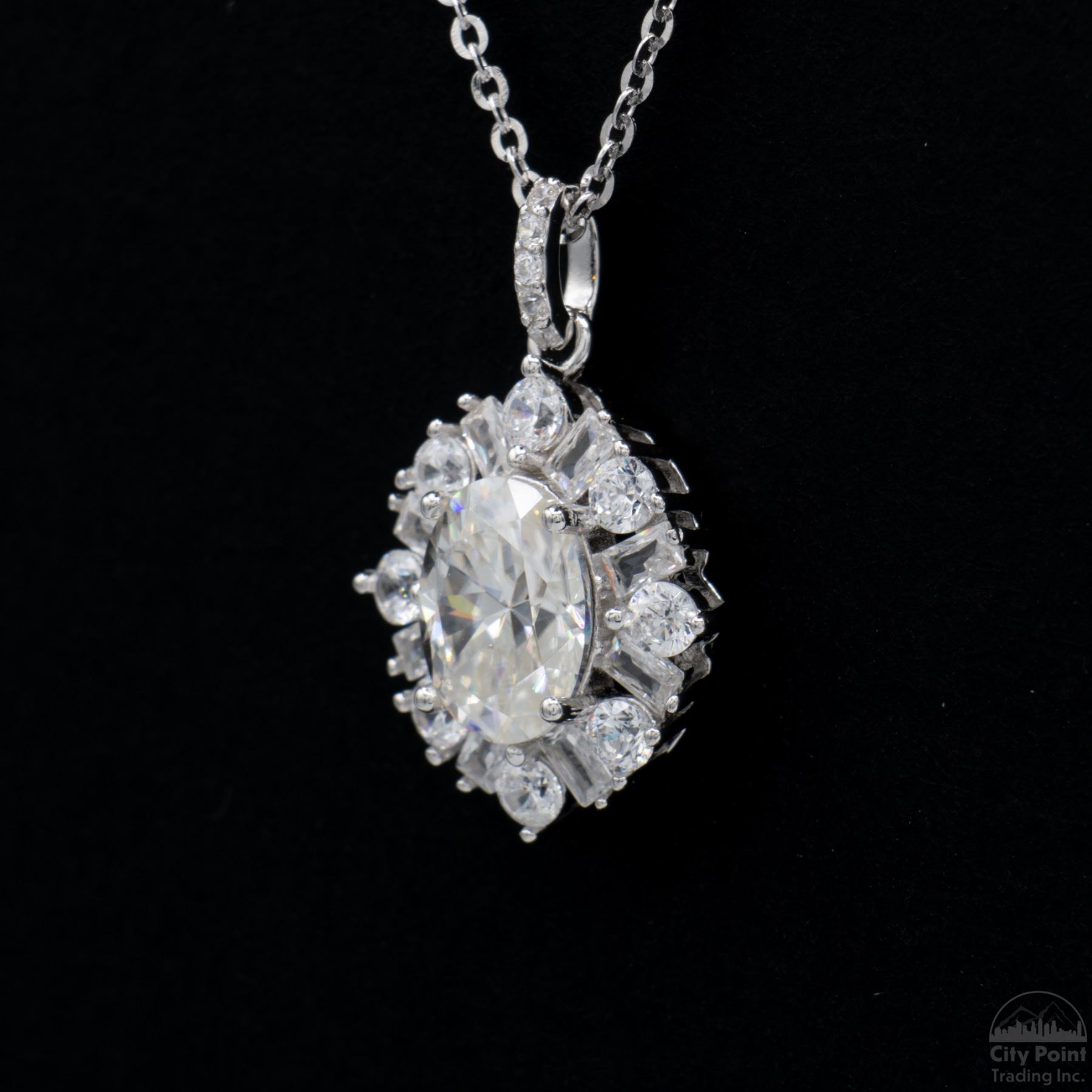One stamped S925 platinum-plated sterling silver necklace weighing 2.70 grams, featuring a pendant with a single prong-set 1.00 carat oval cut moissanite main stone, surrounded by eight round cut and eight baguette cut moissanite side stones. Condition is new. Comes with a box, pouch, and display box.