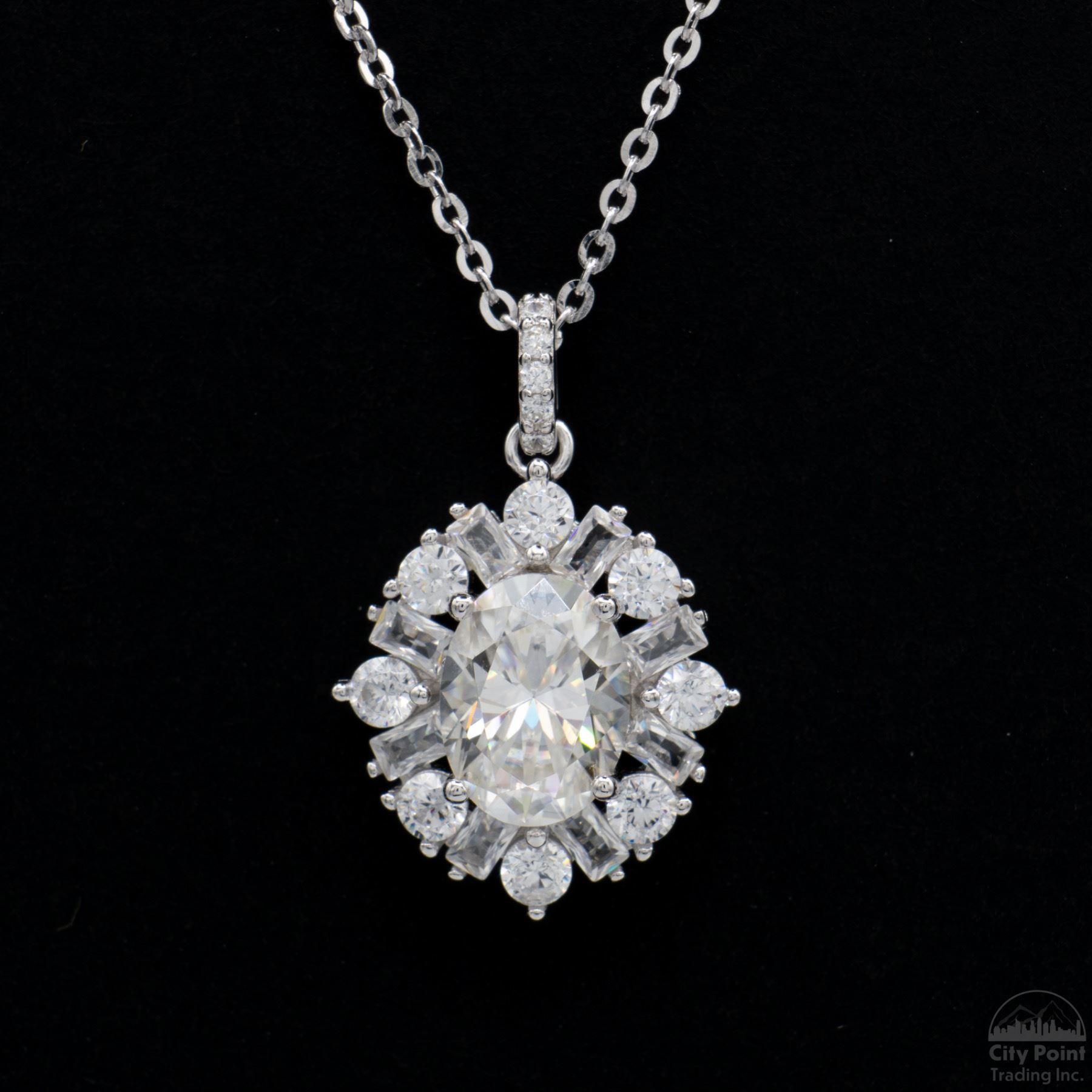 One stamped S925 platinum-plated sterling silver necklace weighing 2.70 grams, featuring a pendant with a single prong-set 1.00 carat oval cut moissanite main stone, surrounded by eight round cut and eight baguette cut moissanite side stones. Condition is new. Comes with a box, pouch, and display box.